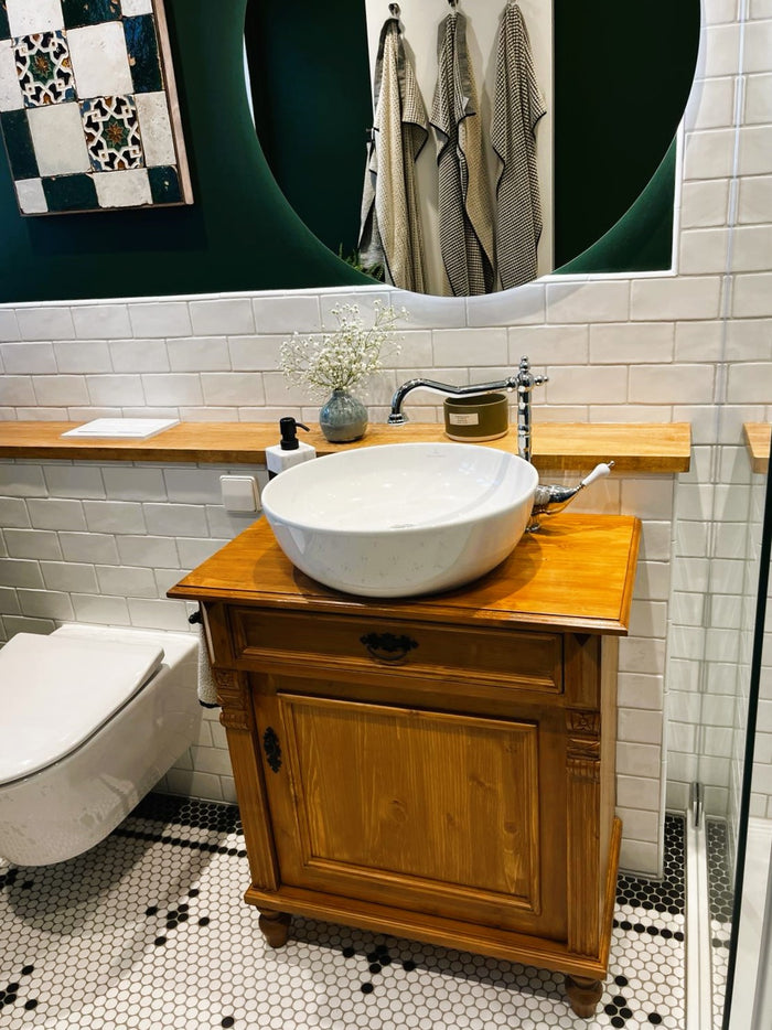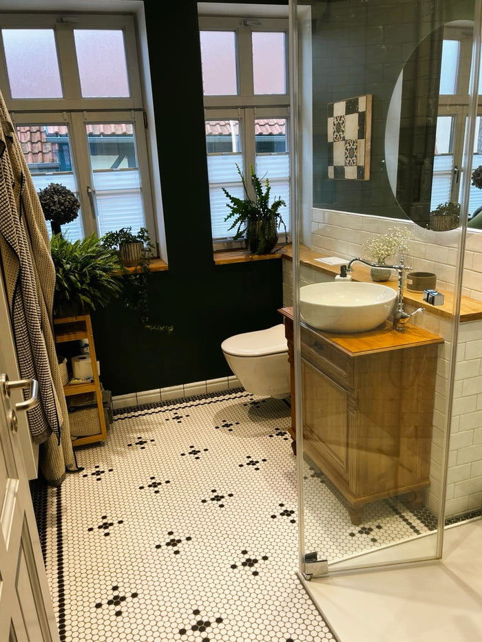 Der „Miracle“ Waschtisch aus hochwertigem Holz bildet das Herzstück und wird durch das geschwungene Waschbecken von Villeroy & Boch stilvoll ergänzt. Auf Wunsch wurden die Beschläge an der Tür und der Schublade, sowie die Handtuchstange an der linken Seite schwarz patiniert. Die glänzende „Mosel Chrom Groß“ Armatur rundet das Bild mit eleganten, funktionalen Details ab.