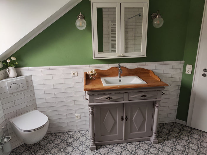 Das erste Bild zeigt das Kundenbad vor der Renovierung, mit weißen Möbeln und roten Akzenten. Das zweite Bild präsentiert das renovierte Badezimmer mit einem antiken Waschtisch in einem schönen Grauton. Der Kontrast zwischen Alt und Neu ist deutlich spürbar und verleiht dem Raum eine einzigartige Atmosphäre.