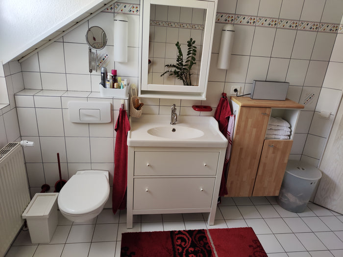 Ein herausragendes Merkmal ist der schöne Boden im gewellten Blumenlook, der dem Raum einen verspielten und dennoch eleganten Touch verleiht. Diese kreative Gestaltung trägt zur Entspannung bei und lädt dazu ein, jeden Moment im Bad zu genießen.