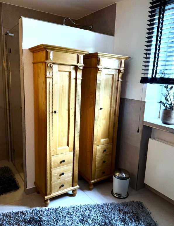 Der individuell angefertigte Waschtisch „Wyn“ mit 100 cm Breite bildet das Herzstück des Raumes. Gefertigt aus massiver Fichte und gekrönt mit einer edlen schwarzen Steinplatte bringt er durch seine warme Holzoptik Ruhe und Natürlichkeit ins Bad. Das ovale Aufsatzbecken ergänzt den Look modern und elegant, während nostalgische Griffe und gedrechselte Füße den Landhausstil unterstreichen. Passend dazu fügt sich der Spiegelschrank „Naceau“ mit seinen beiden Spiegeltüren, stilvollen Verzierungen und praktischen Stauräumen harmonisch in das Gesamtbild ein. Für zusätzlichen Stauraum und optische Symmetrie sorgen zwei Hochschränke „Lillesand“, die links vom Fenster aufgestellt wurden. Ihre klassische Kassettenfront, feinen Zierleisten und kompakten Maße machen sie zu echten Raumwundern – ideal für Handtücher, Pflegeprodukte und alles, was ordentlich verstaut sein soll.