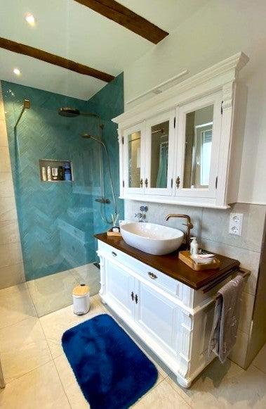 Dieses Badezimmer verbindet klassisch-zeitlose Elemente mit klarer, moderner Gestaltung. Die warmen Naturtöne der Fliesen treffen auf weiße Wände und sichtbare Deckenbalken. Ein stimmiger Mix, der den Raum offen und einladend wirken lässt. Der hellblaue Fliesenbereich mit Fischgrätenmuster setzt einen frischen Farbakzent in der Dusche und verleiht dem Raum eine besondere Tiefe.