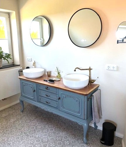 Das umgebaute Unikat überzeugt durch liebevolle Details, geschwungene Beine und ihren charaktervollen Blaugrau-Ton. Die warme Holzplatte trägt zwei weiße Aufsatzwaschbecken – modern in der Form, aber zurückhaltend im Stil. Messingfarbene Armaturen ergänzen das Ensemble mit einem charmanten Vintage-Akzent, der perfekt zum Möbelstück passt.