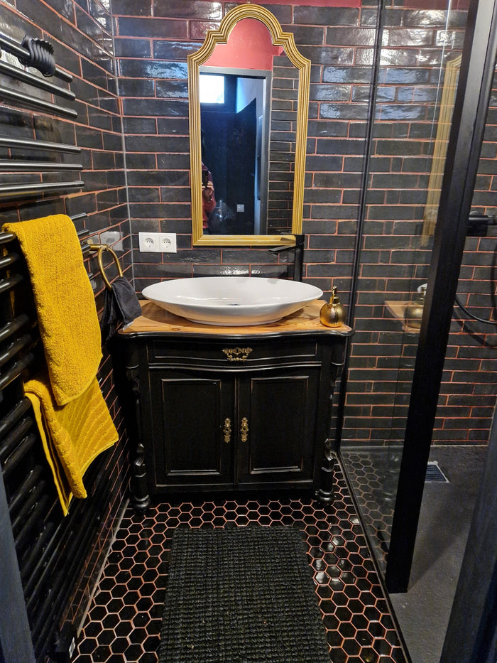 Der antike Waschtisch sticht besonders hervor. In edlem Schwarz, mit goldenen Verzierungen und geschwungenen Formen, verleiht er dem Raum einen Hauch von klassischer Eleganz. Die detailreiche Verarbeitung erinnert an vergangene Zeiten, während der Waschtisch zugleich praktischen Stauraum bietet. Auf dem Möbelstück thront das moderne Waschbecken "Miami" in strahlendem Weiß, das mit seiner flachen, ovalen Form einen harmonischen Kontrast zur antiken Optik des Möbels setzt. Diese Mischung aus Alt und Neu macht das Design einzigartig.