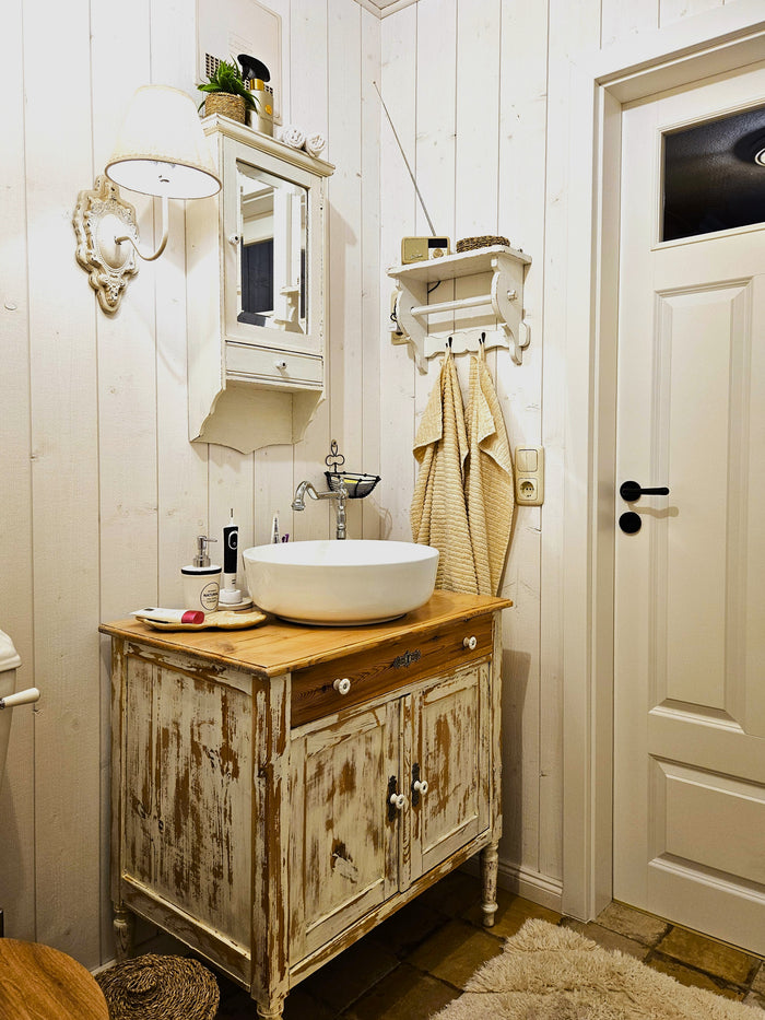 Im anderen Badezimmer dominiert der antike Waschtisch „Vinet“, ein echtes Unikat mit Geschichte. Die charmante Patina, sichtbare Holzstruktur und detailverliebte Verarbeitung verleihen dem Möbelstück Charakter und Tiefe. Die weiß gestrichenen Holzpaneelwände bringen Frische in den Raum und unterstreichen den ländlich-nostalgischen Stil. Mit dem modernen Aufsatzwaschbecken und feinen Accessoires wird aus dem Möbelstück ein funktionales Lieblingsstück voller Authentizität.