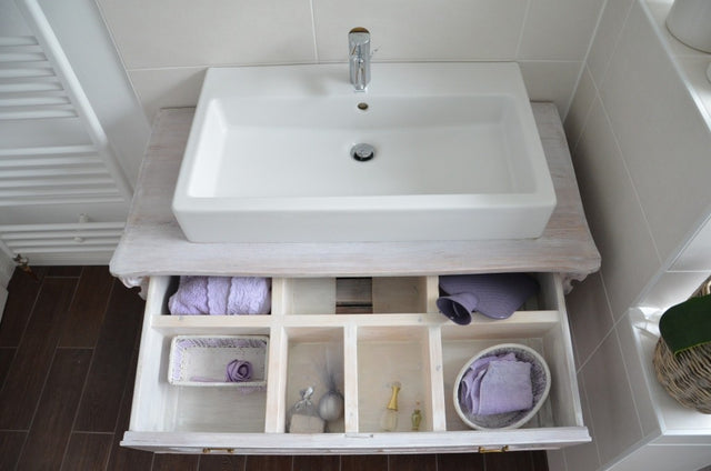 Unsere Fächereinteilung für die Schubladen im Badezimmer sorgt für perfekte Ordnung und Übersichtlichkeit. Mit dieser cleveren Lösung haben Sie alles griffbereit, und nichts vermischt sich. Dank der fest montierten Unterteilung sind keine zusätzlichen Boxen in der Schublade notwendig. Genießen Sie den Komfort einer gut organisierten Schublade, die Ihre Badezimmerutensilien ordentlich und leicht zugänglich hält.
