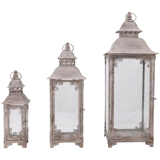 Dieses romantische Ensemble verzaubert durch seine filigranen Details und die nostalgische Anmutung. Die Laternen bestehen aus antikisiertem Metall und wirken wie von anno dazumal.