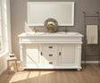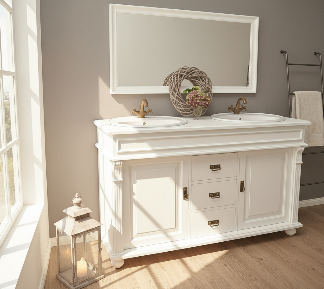 Elegant, romantisch und ganz im Stil des Landhaus-Chic verzaubert der anmutige Doppelwaschtisch "Manchester" das Badezimmer. Mit vielen liebevollen Details im Stil der Gründerzeit präsentiert sich die Front. Die eleganten Kassettenverzierungen hingegen schmücken nicht nur die Front sondern sind auch seitlich zu finden und unterstreichen damit den massiven, eleganten Charme des schönen Badmöbels. Die Beschläge aus Messing heben sich harmonisch auf dem hellen Korpus ab und sind ein weiteres Highlight der Landhaus-Waschkommode.