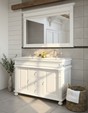 Elegant, romantisch und ganz im Stil des Landhaus-Chic verzaubert der anmutige Doppelwaschtisch "Mirabeaux" das Badezimmer. Mit vielen liebevollen Details im Stil der Gründerzeit präsentiert sich die Front. Die eleganten Kassettenverzierungen hingegen schmücken nicht nur die Front sondern sind auch seitlich zu finden und unterstreichen damit den massiven, eleganten Charme des schönen Badmöbels. Die Beschläge lehnen sich an die Jugendstil-Epoche an und sind feine Tropfenbeschläge.