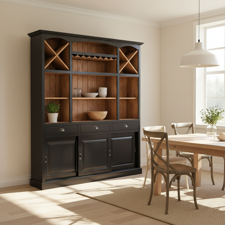 "Colon Noir" - Charmantes Landhaus-Buffet in schwarz mit Platz für Gläser und Weinflaschen