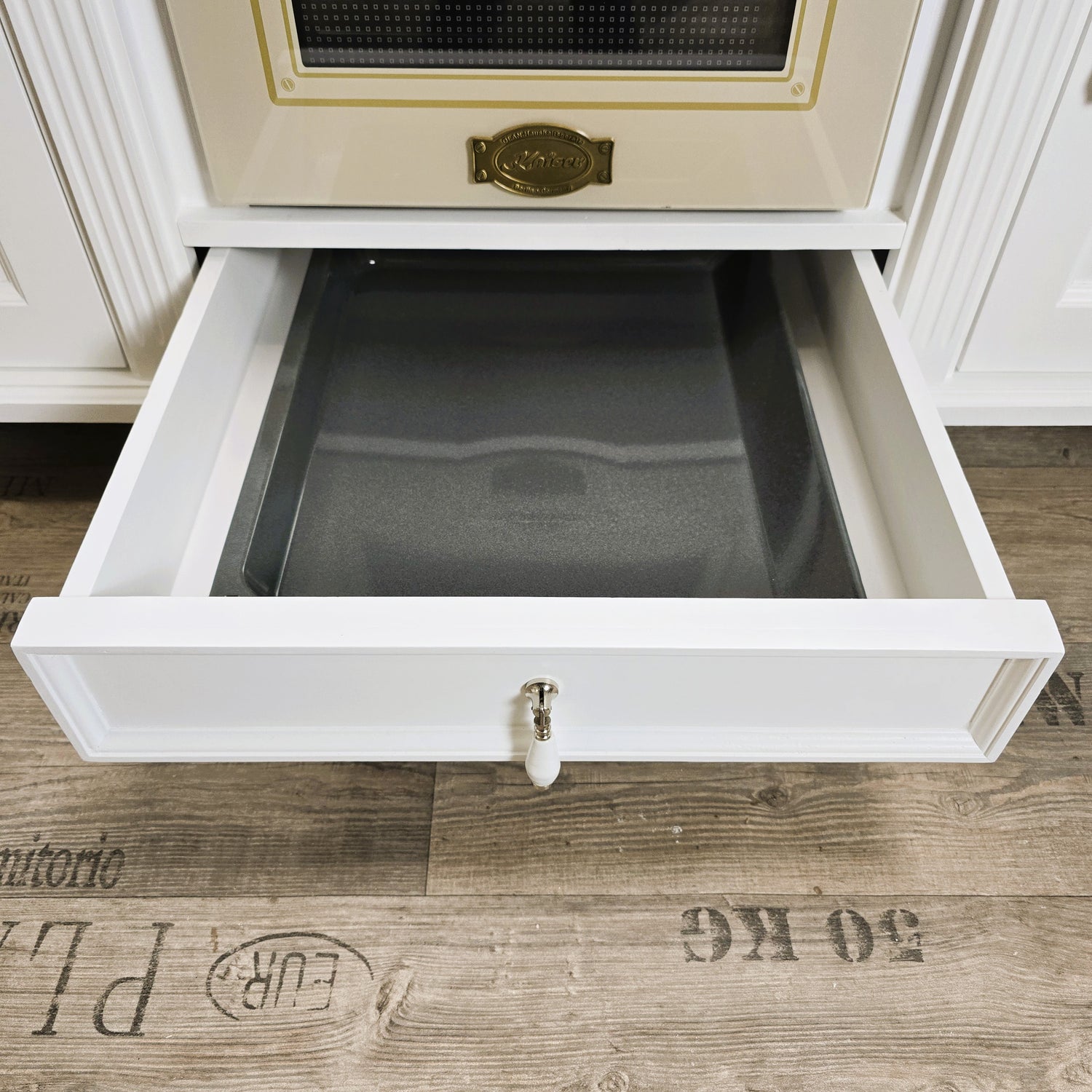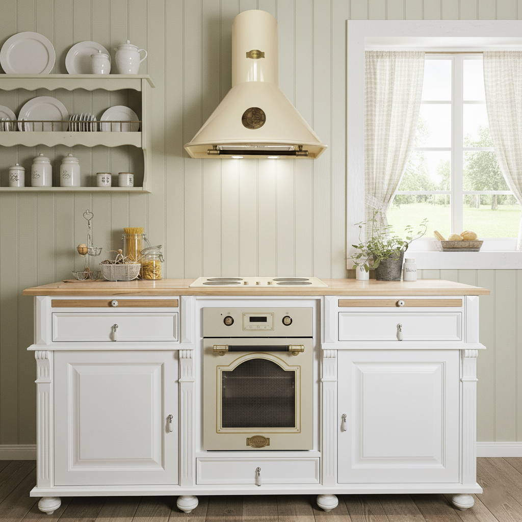 Das Herdmodul im Landhausstil ist ein absolutes Juwel in der Küche, das mit seiner authentischen Schönheit und seiner funktionalen Raffinesse beeindruckt. Hergestellt aus wunderbarem Massivholz, verleiht es dem Raum eine natürliche Eleganz und strahlt eine warme Ausstrahlung aus. Sein frisches Weiß erzeugt eine Atmosphäre von Leichtigkeit und Eleganz, während die Eichendeckplatte einen Hauch von rustikalem Charme hinzufügt.