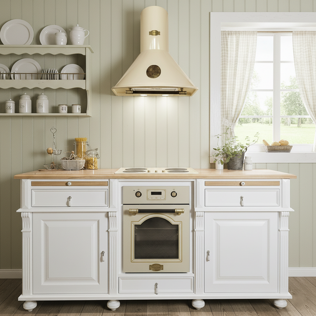 Romantische Dekore im Stil der Gründerzeit rahmen die Front des Herdmoduls und erinnern an eine vergangene Ära der traditionellen Küche. Hier findet das Herz des Hauses seine wahre Bestimmung - das Kochen und Zubereiten köstlicher Gerichte.