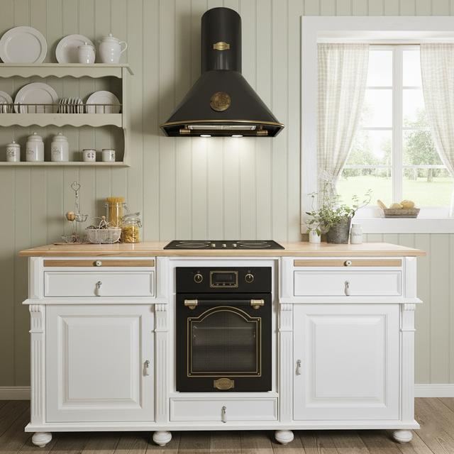 Romantische Dekore im Stil der Gründerzeit rahmen die Front des Herdmoduls und erinnern an eine vergangene Ära der traditionellen Küche. Hier findet das Herz des Hauses seine wahre Bestimmung - das Kochen und Zubereiten köstlicher Gerichte.