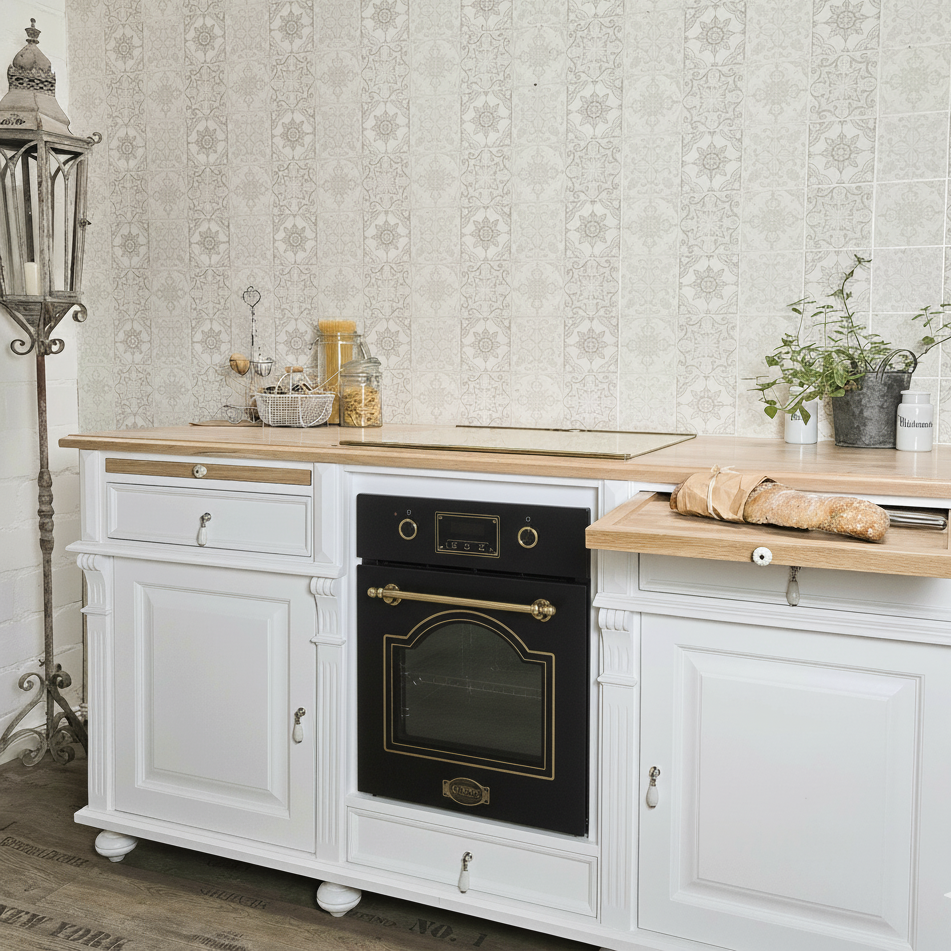 Das edle Design mit massiven Metall-Zierleisten erinnert an die prachtvolle Empire-Zeit, während moderne Drehknebel + Touch-Bedienung eine intuitive Steuerung ermöglichen. Das Zirkulationssystem sorgt für eine sichere Kühlung des Gehäuses, sodass der Backofen problemlos in jede Küchenzeile integriert werden kann.