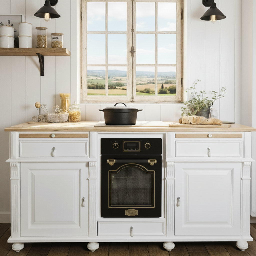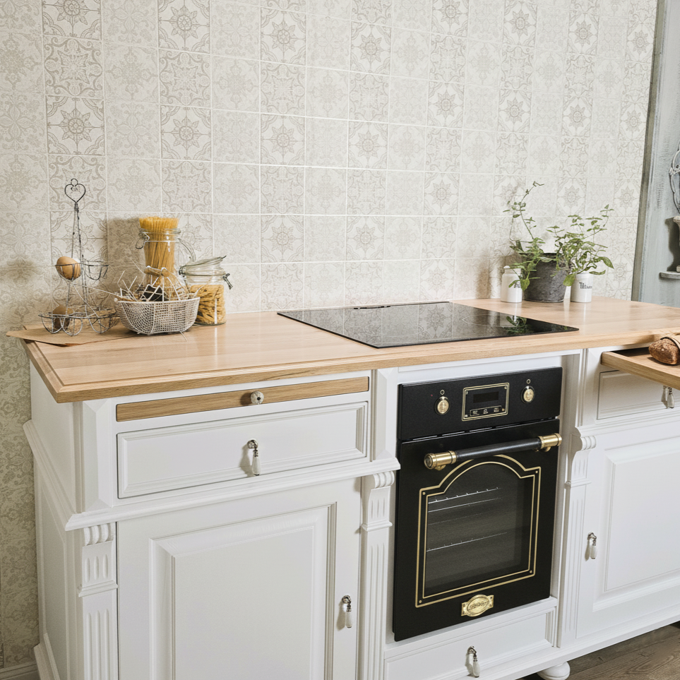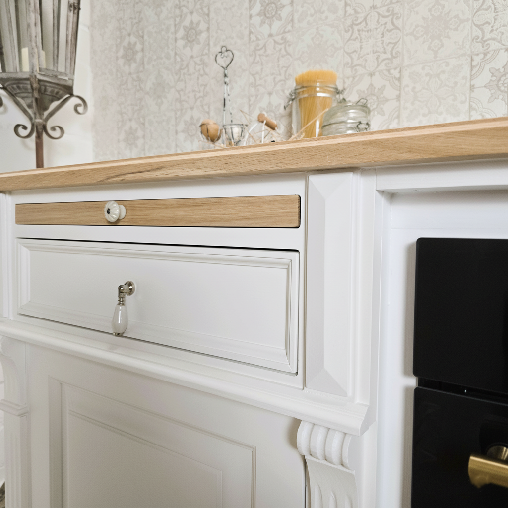 Das Herdmodul im Landhausstil ist ein absolutes Juwel in der Küche, das mit seiner authentischen Schönheit und seiner funktionalen Raffinesse beeindruckt. Hergestellt aus wunderbarem Massivholz, verleiht es dem Raum eine natürliche Eleganz und strahlt eine warme Ausstrahlung aus. Sein frisches Weiß erzeugt eine Atmosphäre von Leichtigkeit und Eleganz, während die Eichendeckplatte einen Hauch von rustikalem Charme hinzufügt.