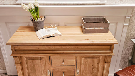 €2.169,00Grundpreis /Nicht verfügbar"Elana" - Landhaus-Buffet, Landhaus Vitrine mit Eichenplatte 138 cm