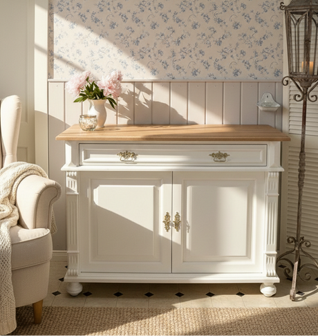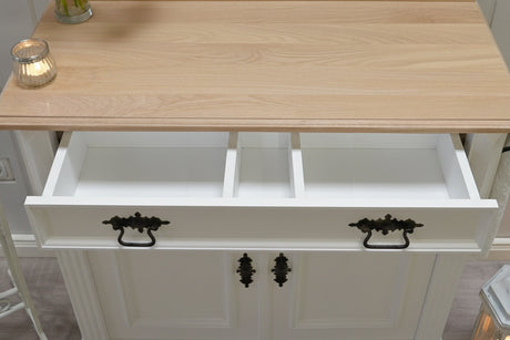 "Kommode Karvia" große weiße Landhaus-Kommode Massivholz Eichenplatte