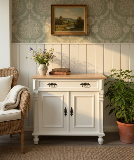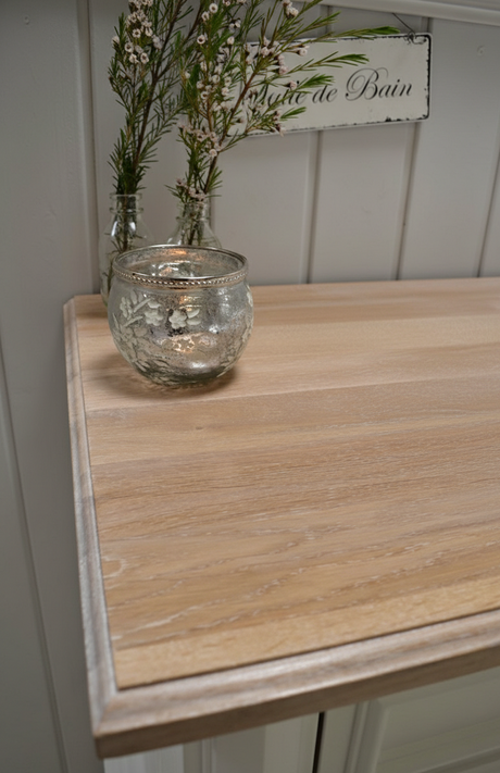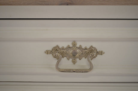 €1.395,00Grundpreis /Nicht verfügbar "Kommode Camille" - weiße Massivholz-Kommode mit Eichenplatte weiß gewischt 80cm / 90cm