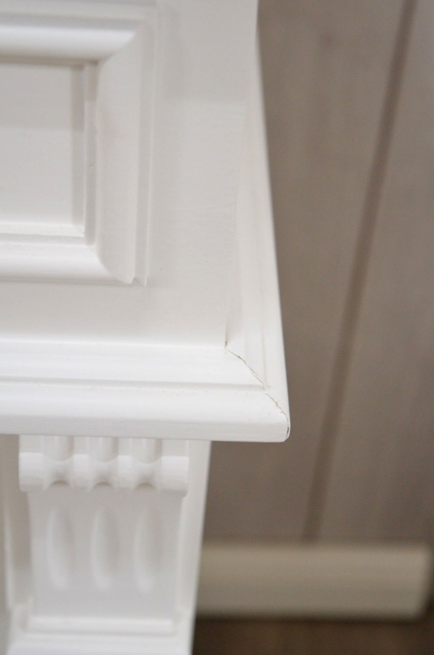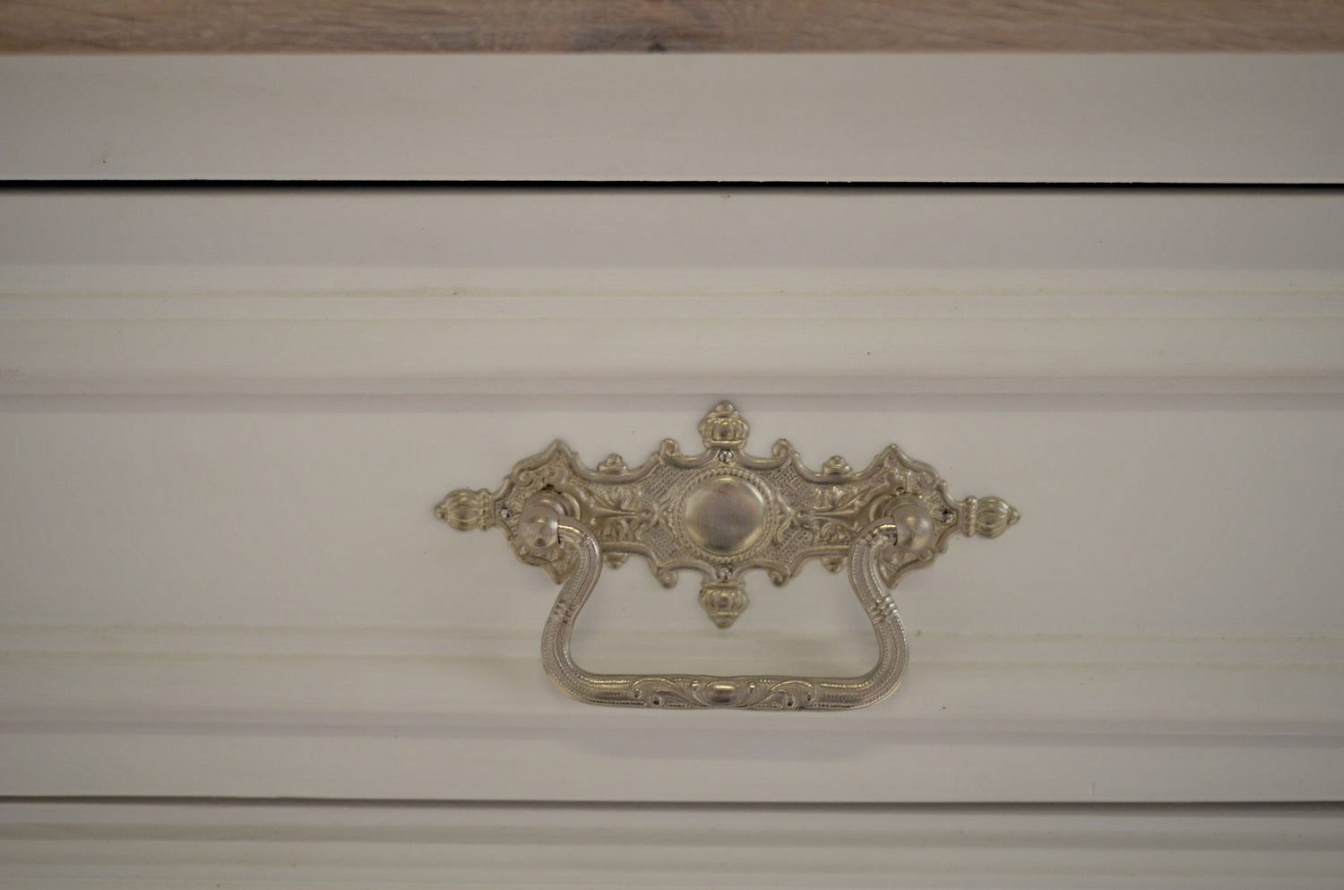Diese anmutige Kommode mit weiß gewachster Eichenplatte wird massiv gefertigt und von Hand in unserer Manufaktur gewachst. Der weiß lackierte Korpus bietet ein schönes Pendant zu den edlen chromfarbenen Beschlägen im Antikstil. Florale Dekore und Zierfräsungen rahmen die Front stilvoll ein und unterstreichen somit den freundlichen, hellen Landhaus-Charakter.