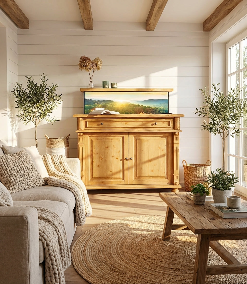 Verstecken Sie Ihren Fernseher in einer wunderschönen, klassischen Kommode im Landhaus-Stil. Per Knopfdruck erhebt sich der Fernseher aus der Kommode.