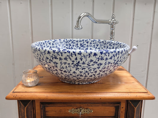 Zeitlos schön und elegant: Dieses Aufsatzbecken aus hochwertiger Keramik überzeugt mit seiner runden Form, dem floralen Design und glänzenden Oberfläche. Es wird auf der Waschkommode platziert und ist ideal für die Kombination mit einer Wand- oder Standarmatur.