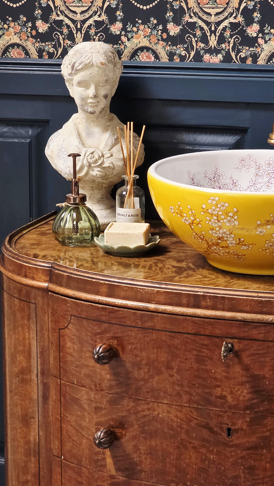 Aus dem antiken Buffet wurde letzte Woche noch ein ganz besonderes schöner Waschtisch- ein Blickfang für das besondere Landhaus Badezimmer, mit dem Chic und Charme einer längst vergangenen Epoche.