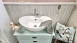 Auf Zeitreise im Badezimmer- wer hier das Bad betritt wähnt sich in einer anderen Epoche: wo einst Schüssel und Krug standen, ist nun eine feine Keramikschüssel mit nostalgisch anmutenden Armatur platziert. Die Schublade und das kleine Türfach mit Zinkverkleidung für die Wärmflasche, wurden durchdacht umgebaut und sind weiterhin nutzbar.