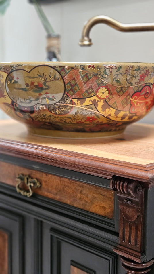 Aus dem antiken Buffet wurde letzte Woche noch ein ganz besonderes schöner Waschtisch- ein Blickfang für das besondere Landhaus Badezimmer, mit dem Chic und Charme einer längst vergangenen Epoche.