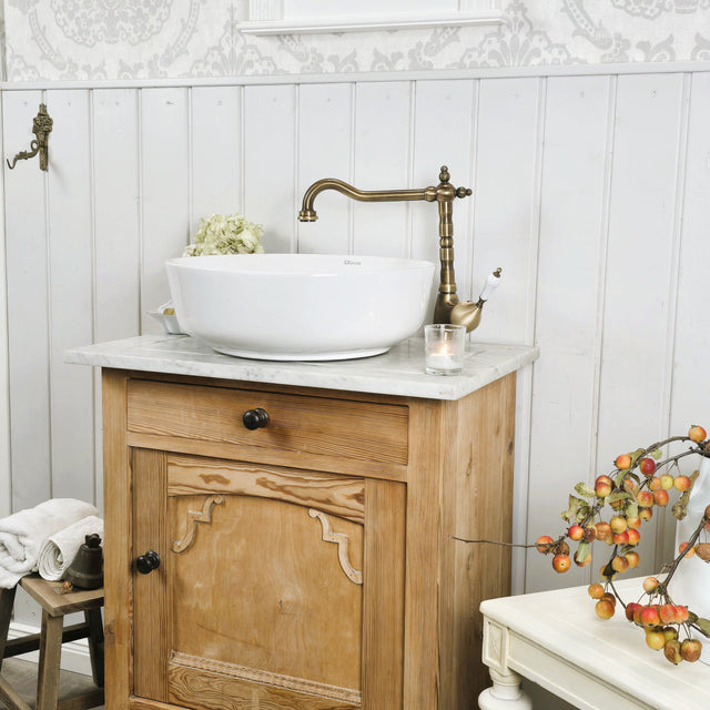Ein Waschtisch für die Seele- uriges Holz, markante Patina und romantische Dekore zaubern ein herrlich nostalgisches Ambiente, mit ländlicher Leichtigkeit ins Bad-Interieur. Der antike, dänische Waschtische in seinem markanten Holz-Ton wird zum Blickfang im Badezimmer. Auf der original Marmorplatte mit Wasserrille standen früher Schüssel und Krug zum Waschen- heute befindet sich dort die moderne Waschschüssel.