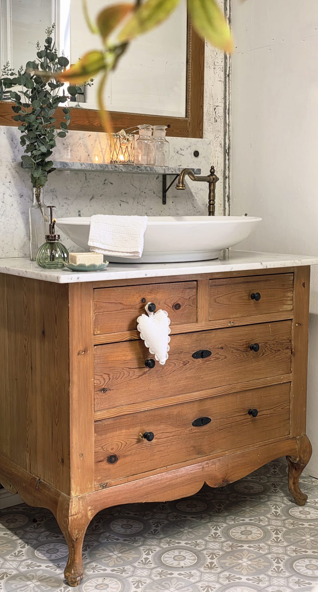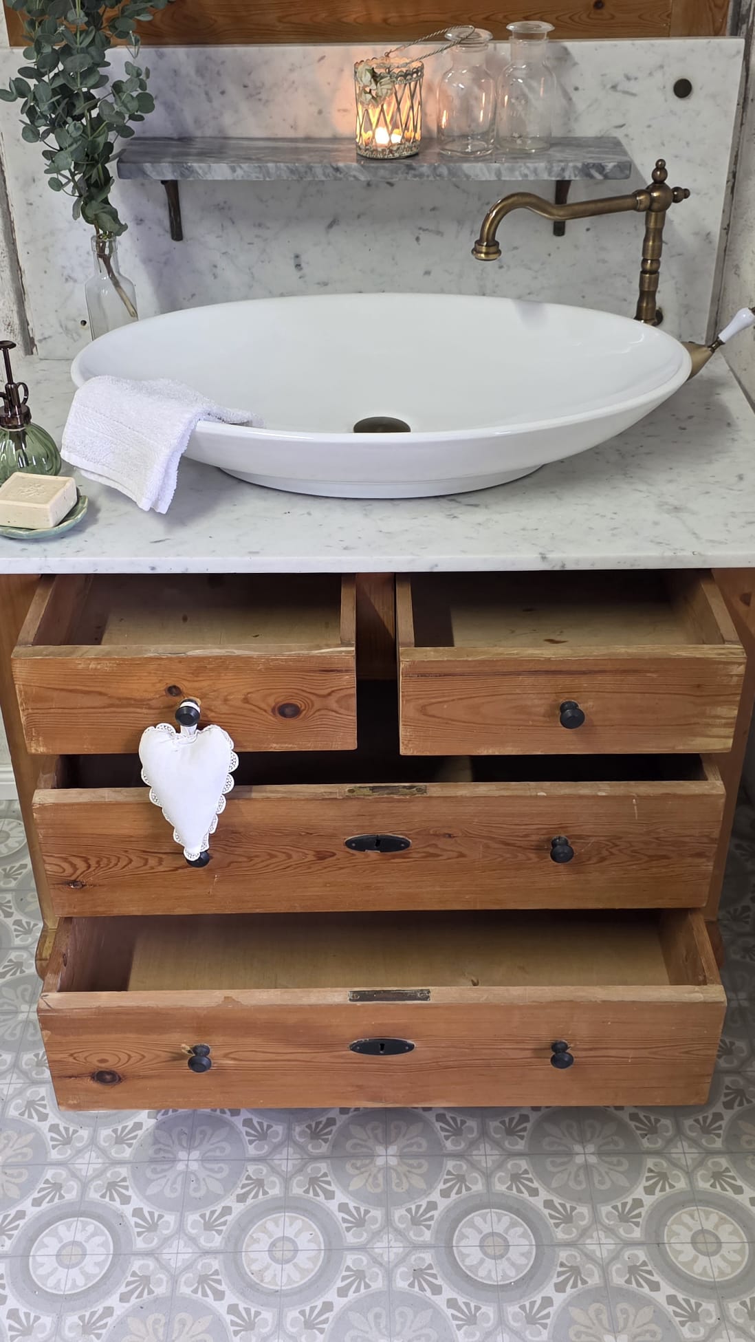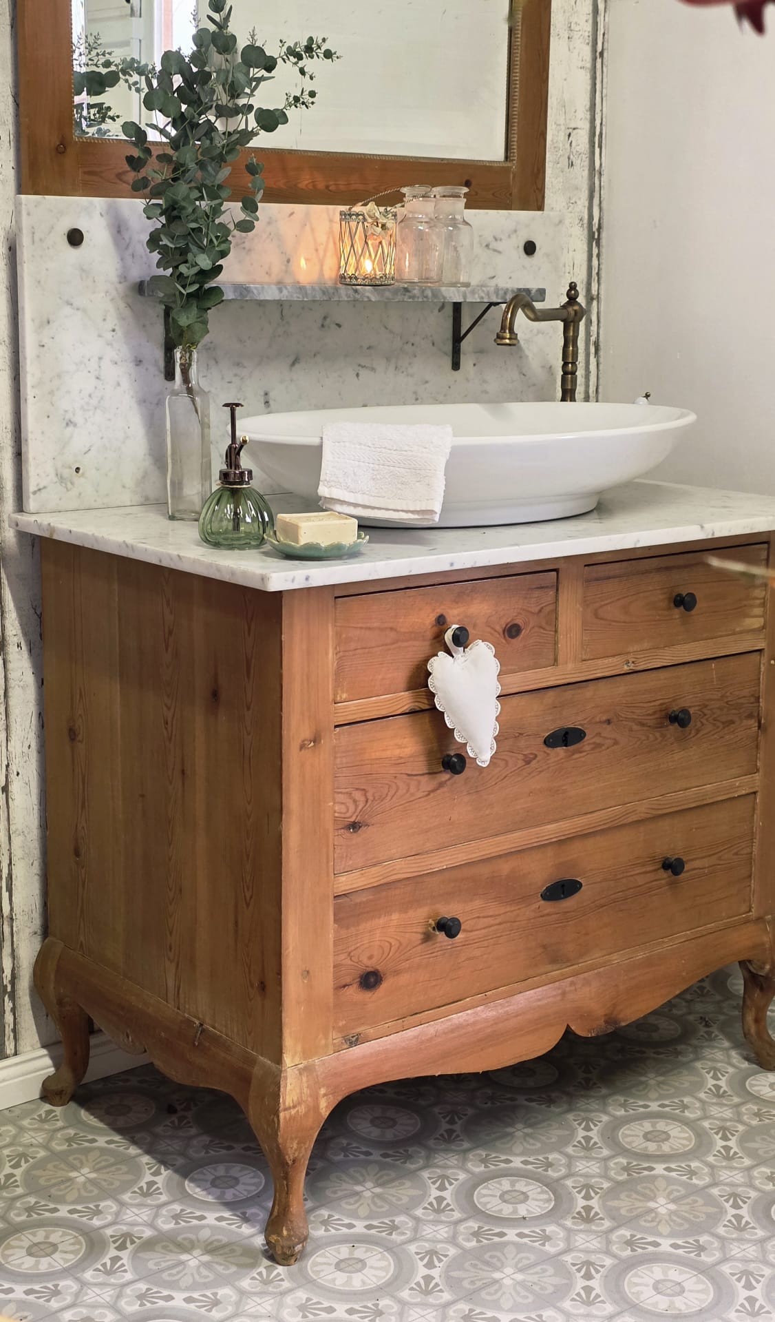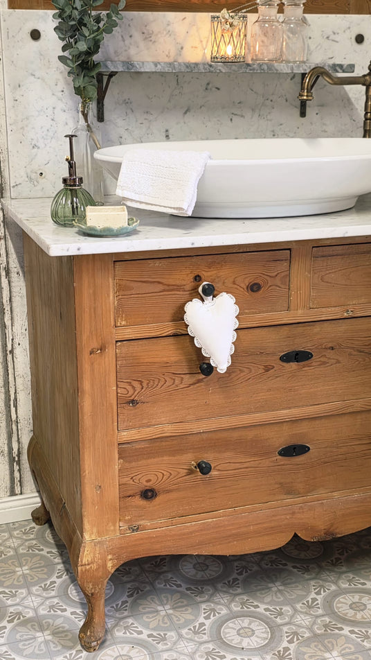 Unser Waschtisch ist ein echtes Unikat. Ursprünglich als antike Kommode zu uns gekommen, wurde sie in unserer Manufaktur zu einem echten vintage Waschtisch umgewandelt. Dabei achten wir besonders darauf, die Geschichte der Kommode zu bewahren. Um den nostalgischen Vintage-Charme zu erhalten, haben wir nicht alle Gebrauchsspuren und Abnutzungsspuren entfernt. So bleibt die besondere Geschichte jedes Stücks lebendig.