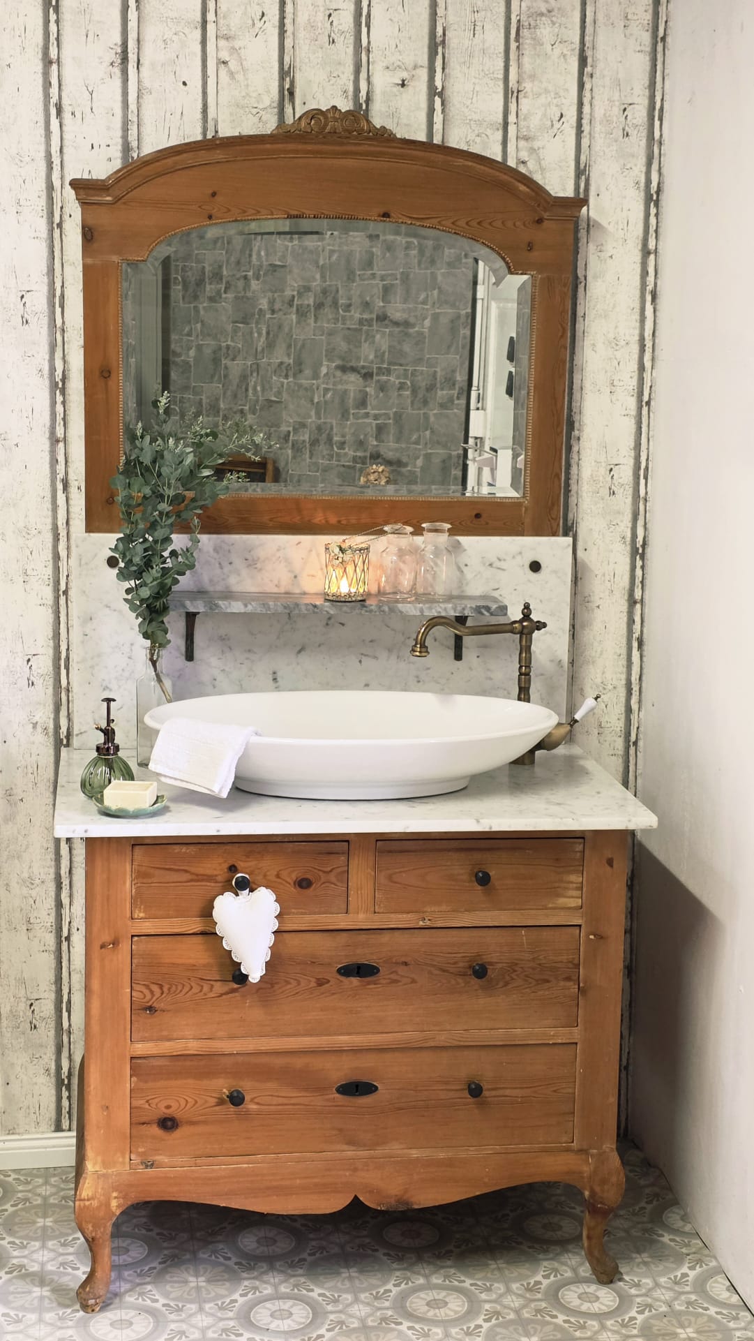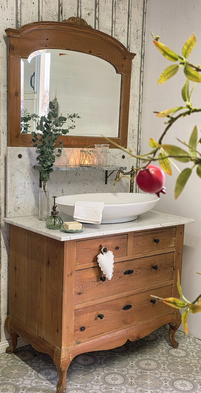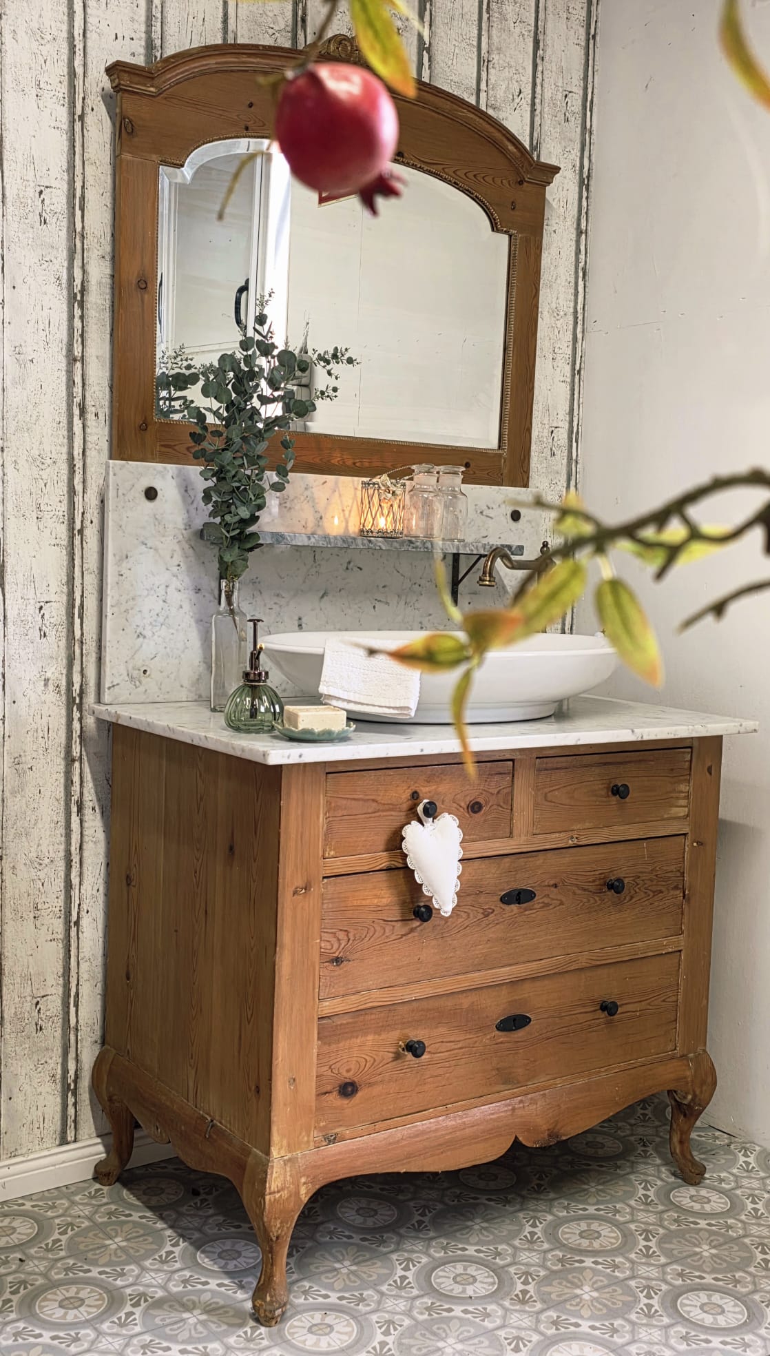 Unser Waschtisch ist ein echtes Unikat. Ursprünglich als antike Kommode zu uns gekommen, wurde sie in unserer Manufaktur zu einem echten vintage Waschtisch umgewandelt. Dabei achten wir besonders darauf, die Geschichte der Kommode zu bewahren. Um den nostalgischen Vintage-Charme zu erhalten, haben wir nicht alle Gebrauchsspuren und Abnutzungsspuren entfernt. So bleibt die besondere Geschichte jedes Stücks lebendig.