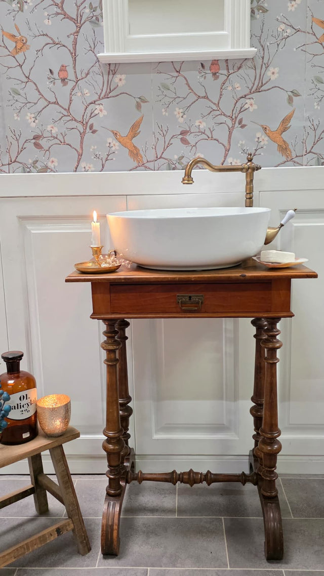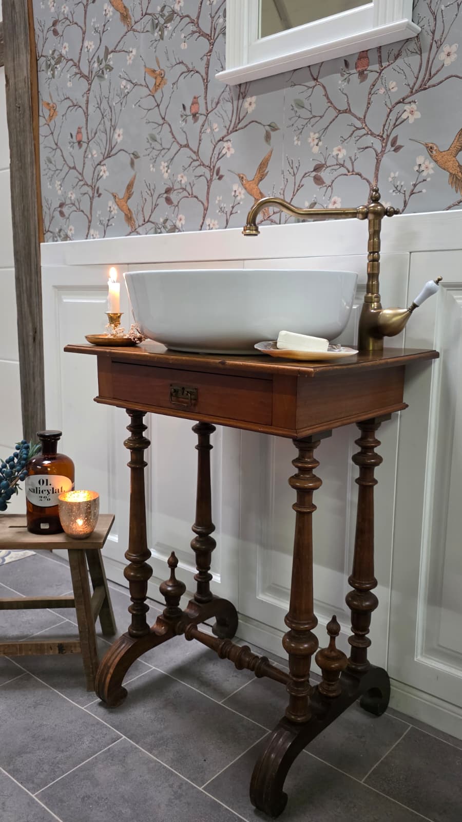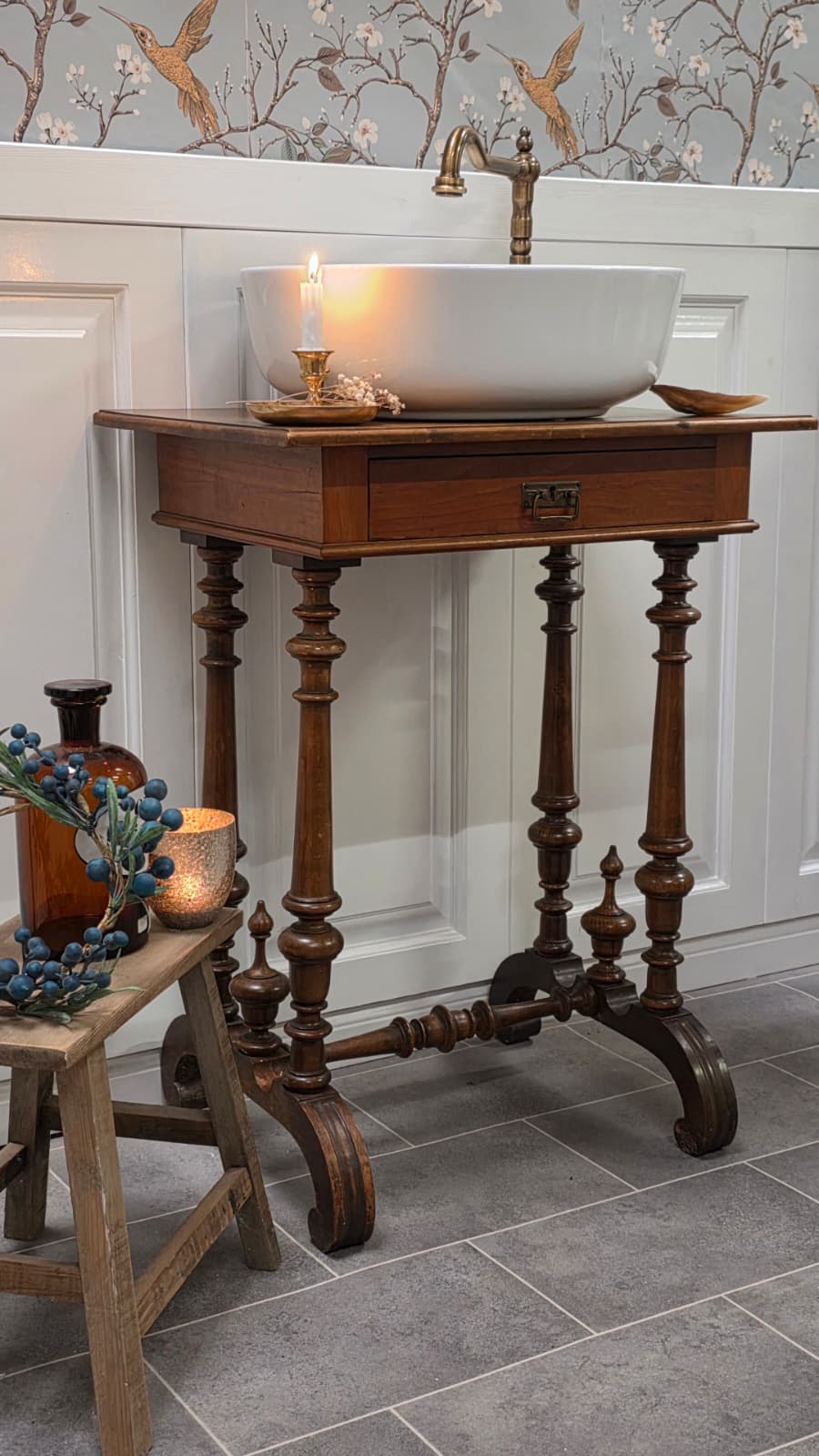 Sanft wandert das Auge über die feine Linienführung des nostalgischen Waschtisches und lässt sich vom rustikalen Spiel der Nostalgie und Moderne verzaubern. So zelebrieren wir gerne die alltäglich Wäsche und genießen den urigen Flair, welcher mit dem anmutigen Solitär, im Bad Einzug hält. Das schmucke Nähtischchen aus Dänemark stammt aus der Gründerzeit und wurde von uns behutsam restauriert und zum Waschtisch umgebaut. Die schöne Patina und damit die Zeichen der Zeit wurden nicht wegrestauriert sondern sind versiegelt geworden. Die Schublade wurden sorgsam umgebaut und bietet zusammen mit dem unteren Boden ausreichend Stauraum für alle benötigten Bad-Utensilien.