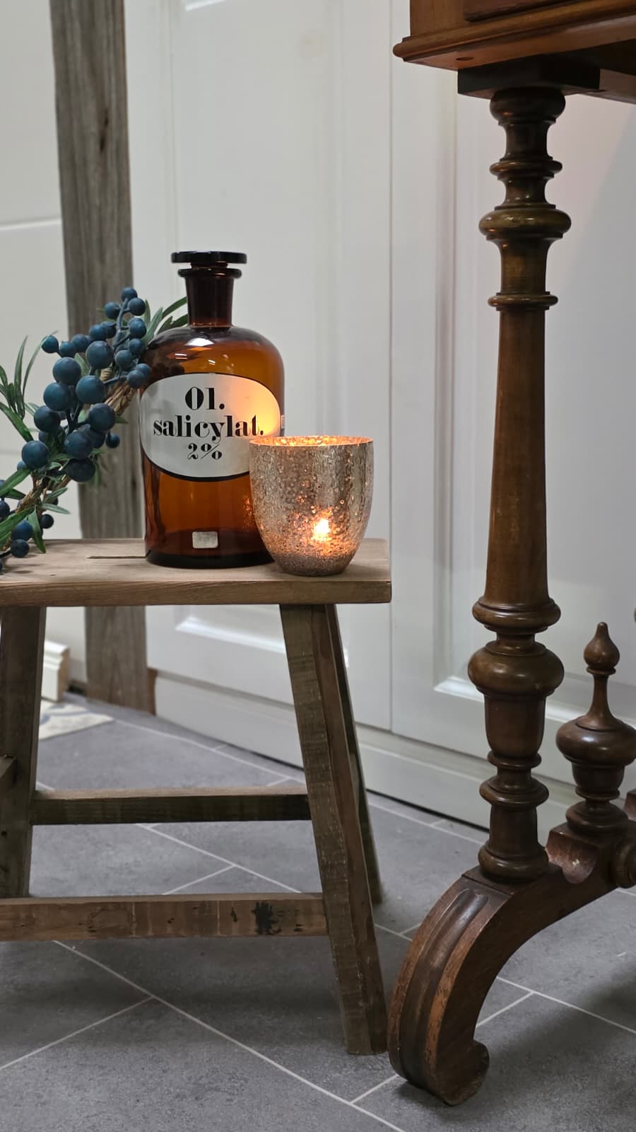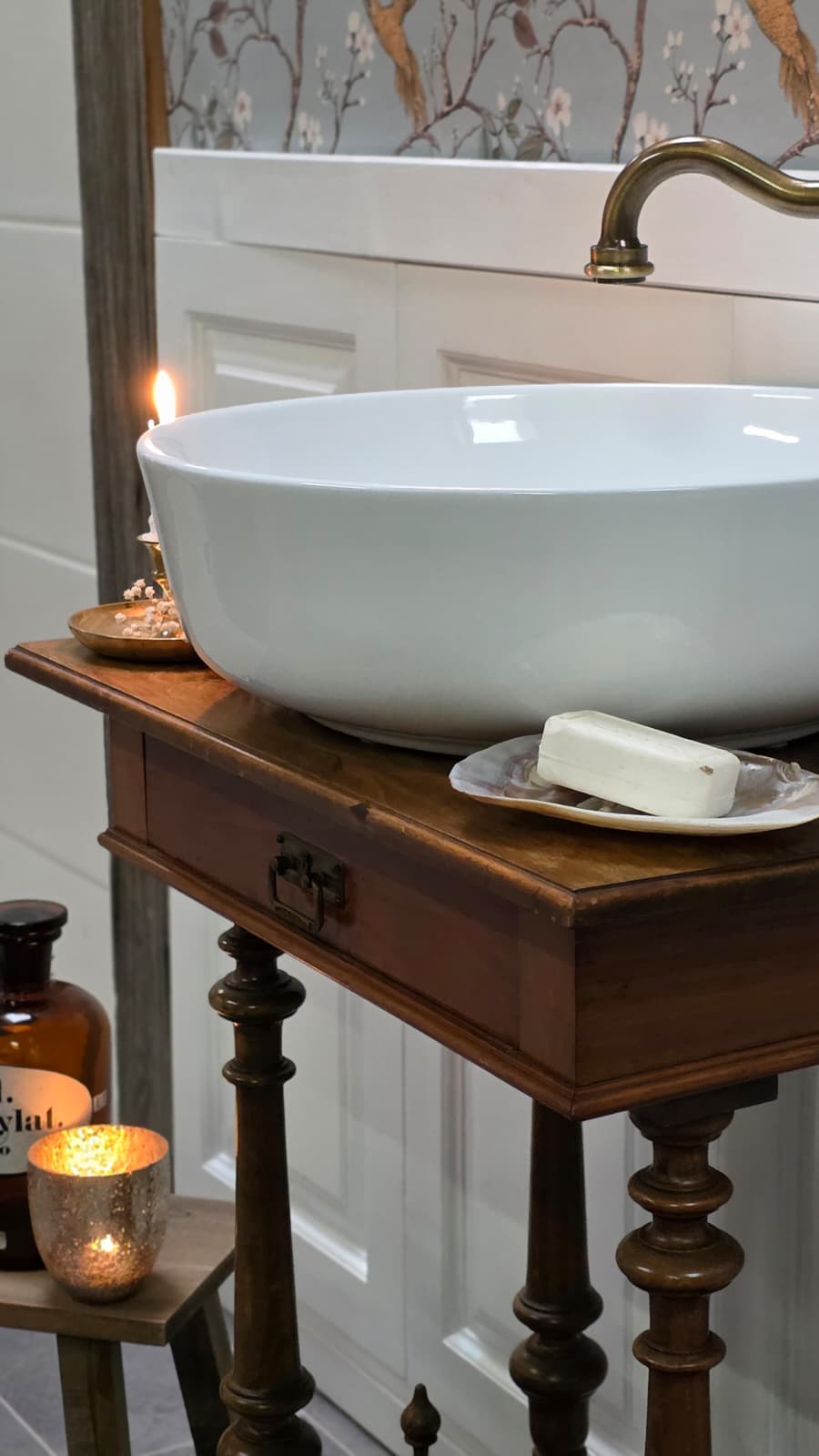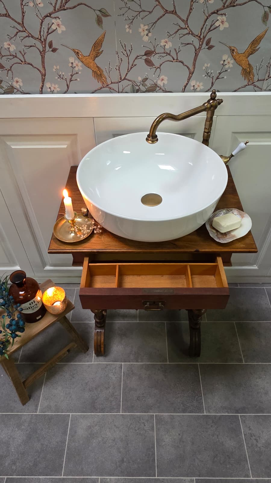 Sanft wandert das Auge über die feine Linienführung des nostalgischen Waschtisches und lässt sich vom rustikalen Spiel der Nostalgie und Moderne verzaubern. So zelebrieren wir gerne die alltäglich Wäsche und genießen den urigen Flair, welcher mit dem anmutigen Solitär, im Bad Einzug hält. Das schmucke Nähtischchen aus Dänemark stammt aus der Gründerzeit und wurde von uns behutsam restauriert und zum Waschtisch umgebaut. Die schöne Patina und damit die Zeichen der Zeit wurden nicht wegrestauriert sondern sind versiegelt geworden. Die Schublade wurden sorgsam umgebaut und bietet zusammen mit dem unteren Boden ausreichend Stauraum für alle benötigten Bad-Utensilien.