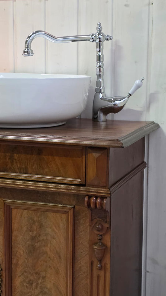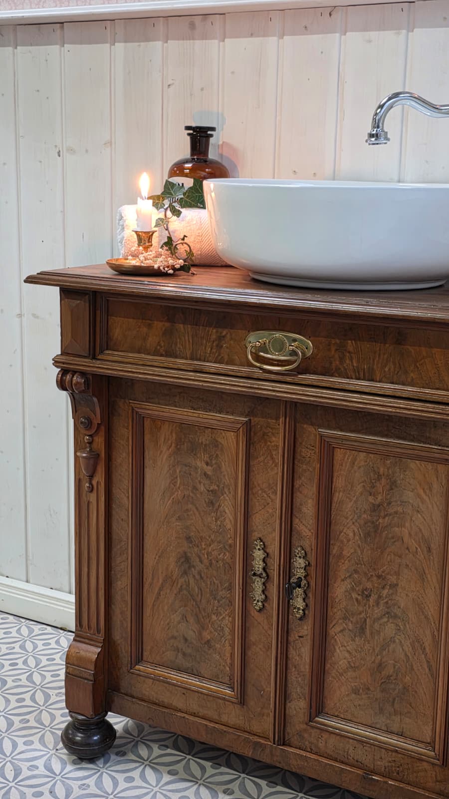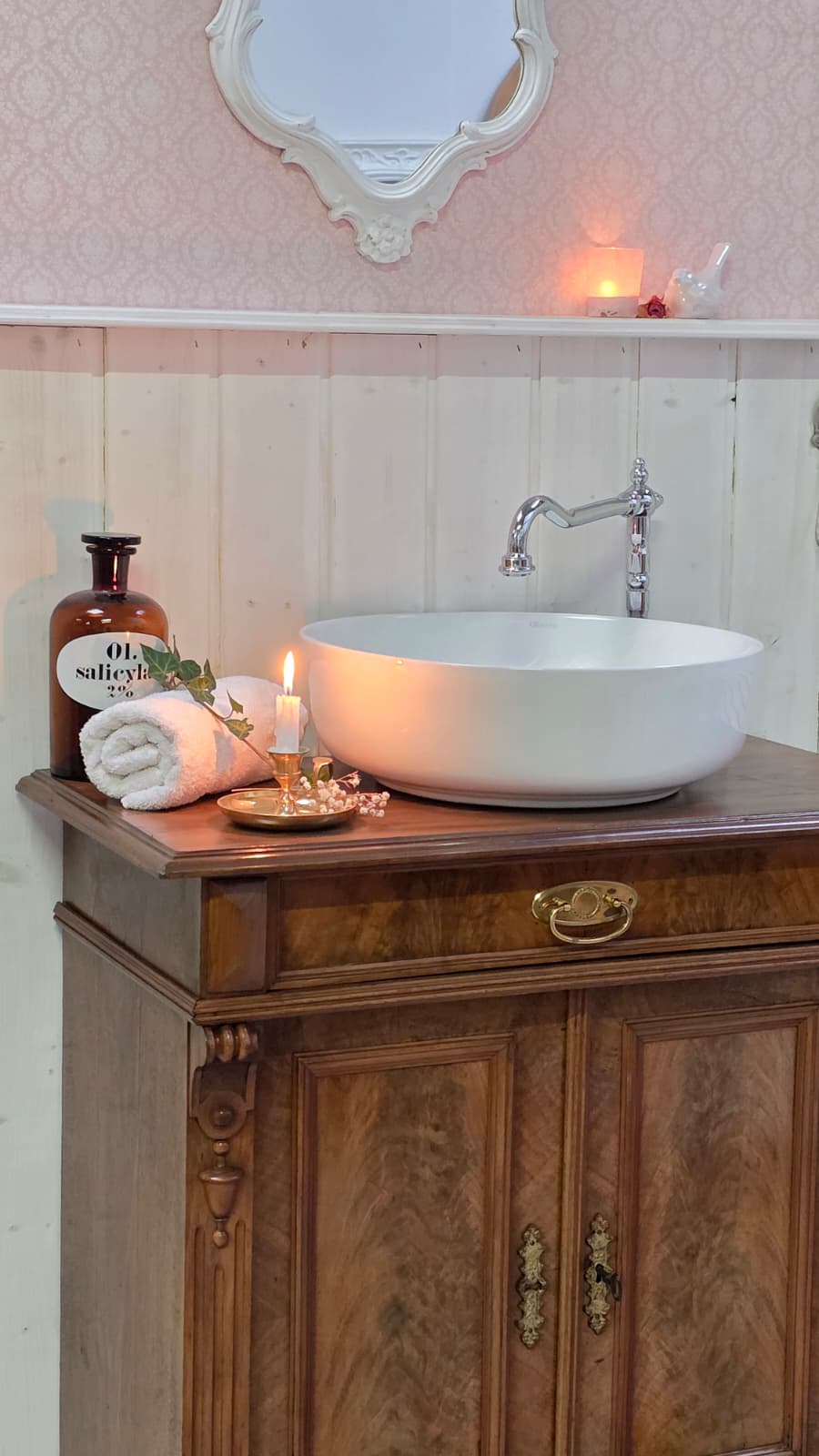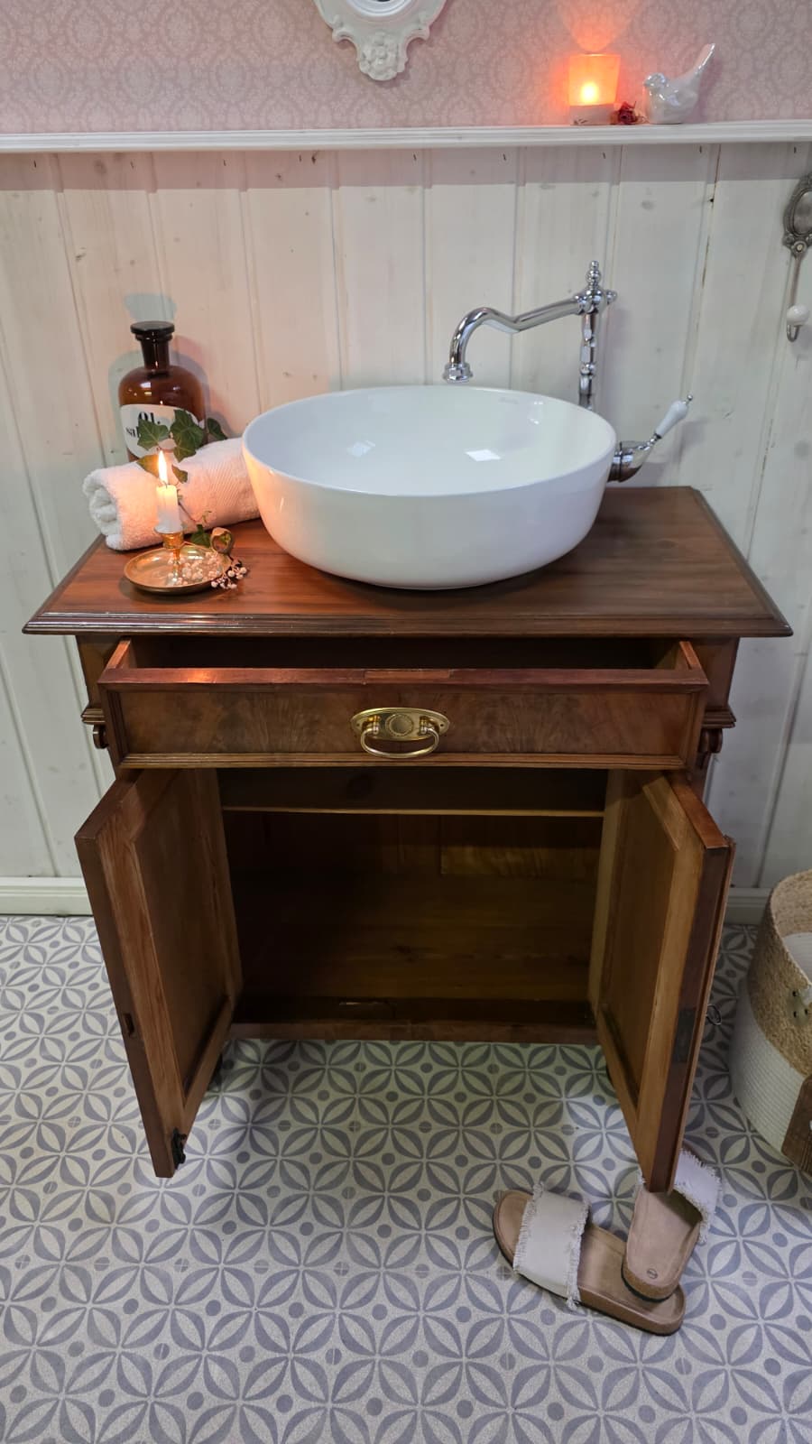 Unser Waschtisch ist ein echtes Unikat. Ursprünglich als antike Kommode zu uns gekommen, wurde sie in unserer Manufaktur zu einem echten vintage Waschtisch umgewandelt. Dabei achten wir besonders darauf, die Geschichte der Kommode zu bewahren. Um den nostalgischen Vintage-Charme zu erhalten, haben wir nicht alle Gebrauchsspuren und Abnutzungsspuren entfernt. So bleibt die besondere Geschichte jedes Stücks lebendig.