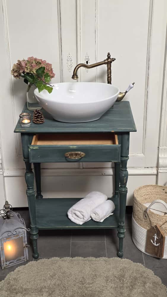 Aus dem antiken Buffet wurde letzte Woche noch ein ganz besonderes schöner Waschtisch- ein Blickfang für das besondere Landhaus Badezimmer, mit dem Chic und Charme einer längst vergangenen Epoche.