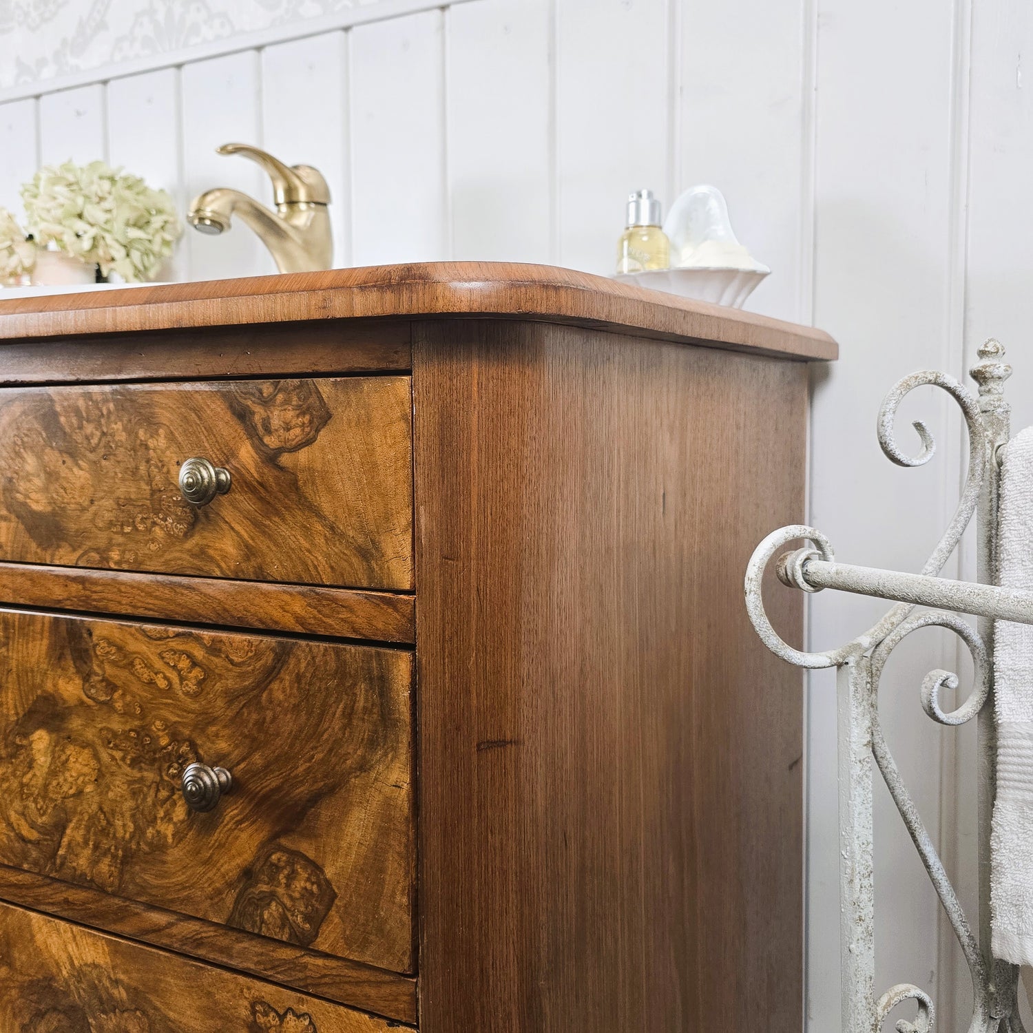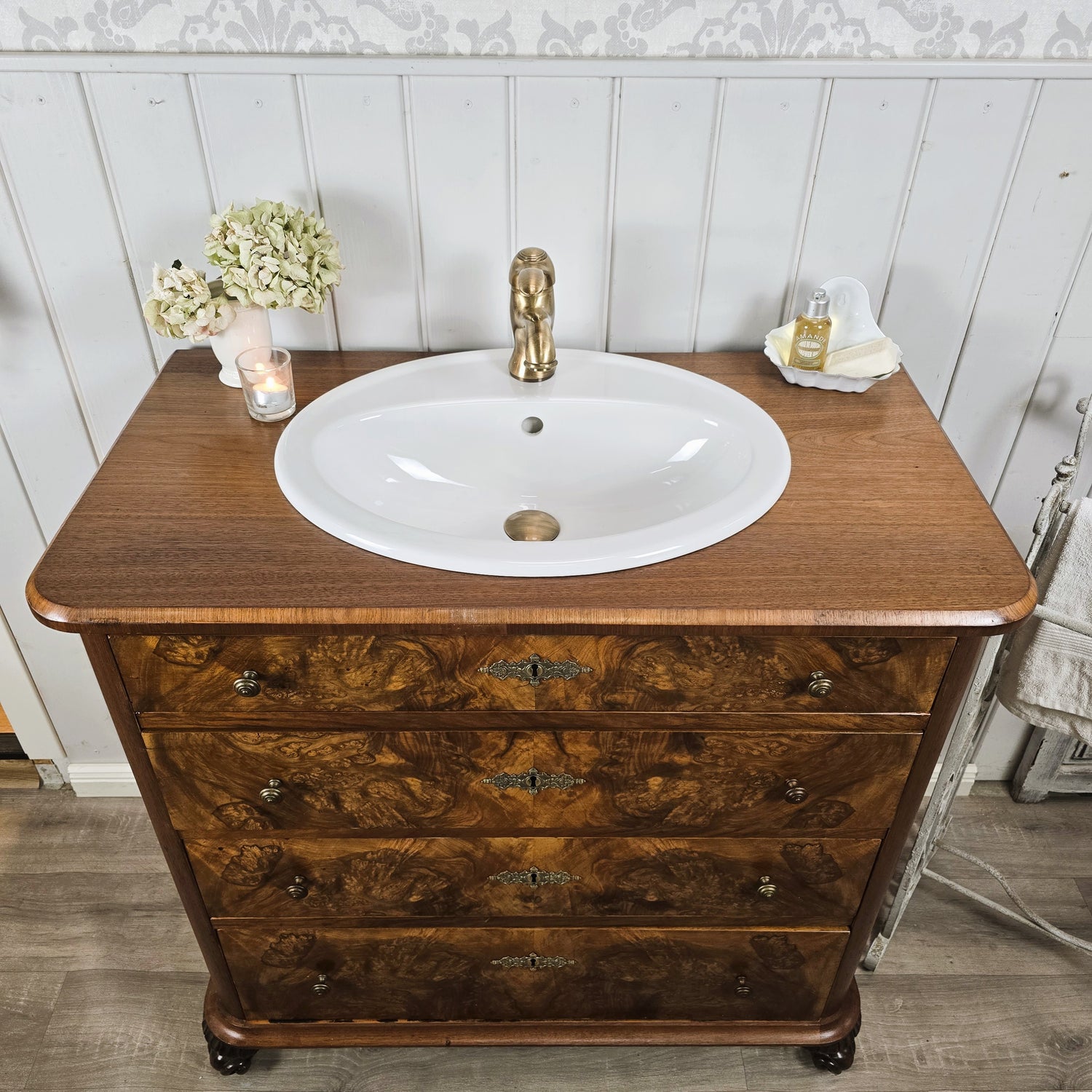 Ein liebevoll restaurierter Waschtisch – einst eine edle Kommode, nun neu zum Leben erweckt. Das feine Furnier verleiht ihm eine warme, elegante Ausstrahlung und die weiche Bauweise und seinen opulenten Füße einen noblen Chic.