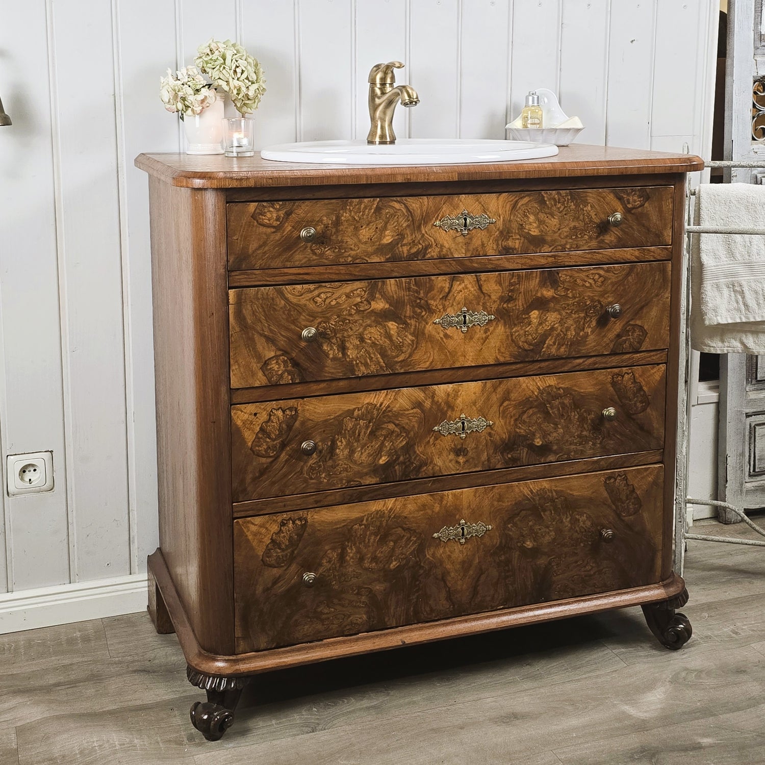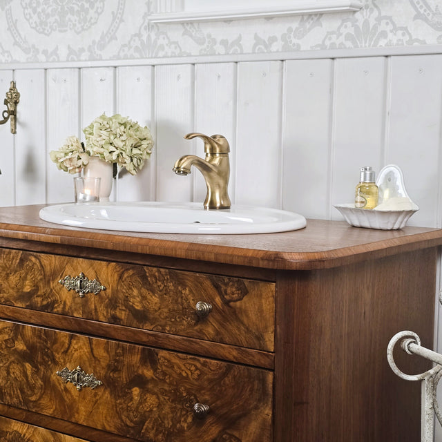 Unser Waschtisch ist ein echtes Unikat. Ursprünglich als antike Kommode zu uns gekommen, wurde sie in unserer Manufaktur zu einem echten vintage Waschtisch umgewandelt. Dabei achten wir besonders darauf, die Geschichte der Kommode zu bewahren. Um den nostalgischen Vintage-Charme zu erhalten, haben wir nicht alle Gebrauchsspuren und Abnutzungsspuren entfernt. So bleibt die besondere Geschichte jedes Stücks lebendig.