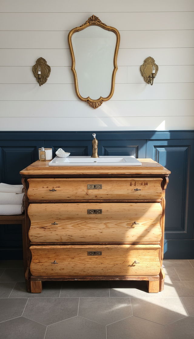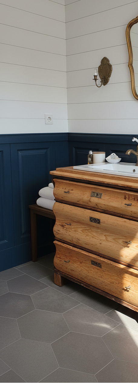 Das elegante Landhaus Waschbecken fügt sich harmonisch ein und macht dieses Stück zu einem besonderen Blickfang.