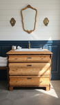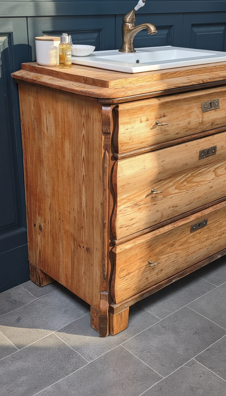 Ein liebevoll restaurierter Waschtisch – einst nostalgische Bauern-Kommode, nun neu zum Leben erweckt, erstrahlt er nun in seiner neuen Funktion als Landhaus Waschtisch. Das urige Holz verleiht der Waschkommode eine warme, ländliche Ausstrahlung und zaubert Gemütlichkeit ins Bad Ambiente.
