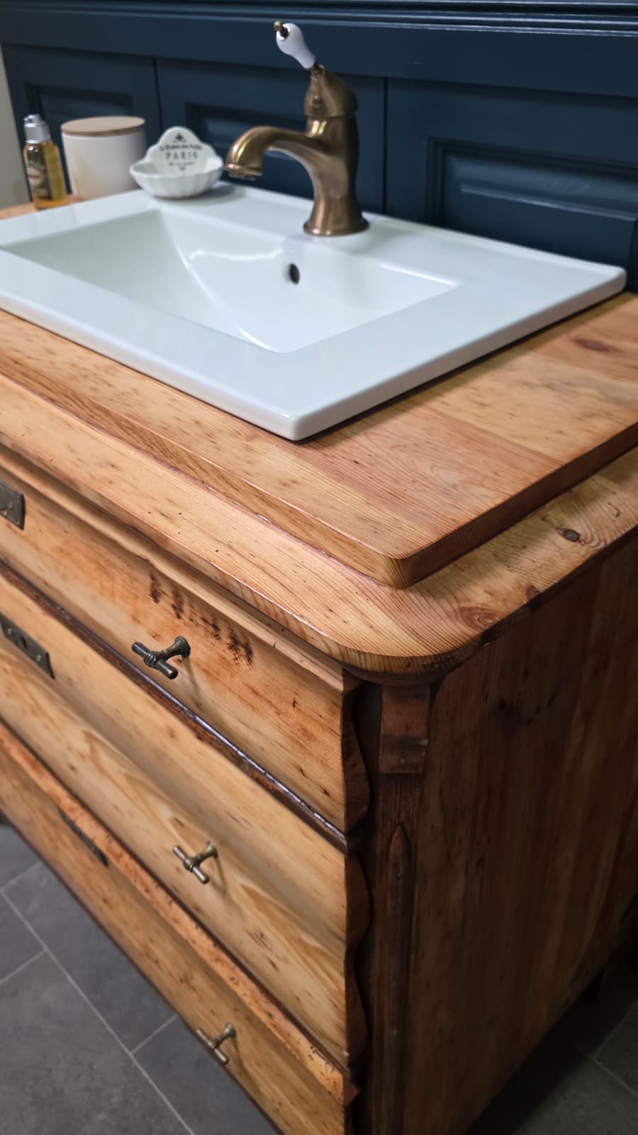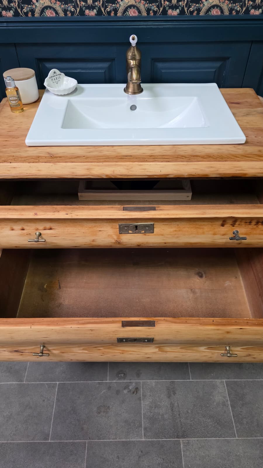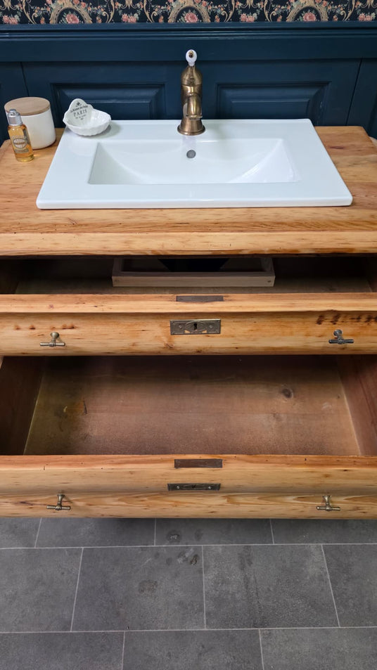 Unser Waschtisch ist ein echtes Unikat. Ursprünglich als antike Kommode zu uns gekommen, wurde sie in unserer Manufaktur zu einem echten vintage Waschtisch umgewandelt. Dabei achten wir besonders darauf, die Geschichte der Kommode zu bewahren. Um den nostalgischen Vintage-Charme zu erhalten, haben wir nicht alle Gebrauchsspuren und Abnutzungsspuren entfernt. So bleibt die besondere Geschichte jedes Stücks lebendig.