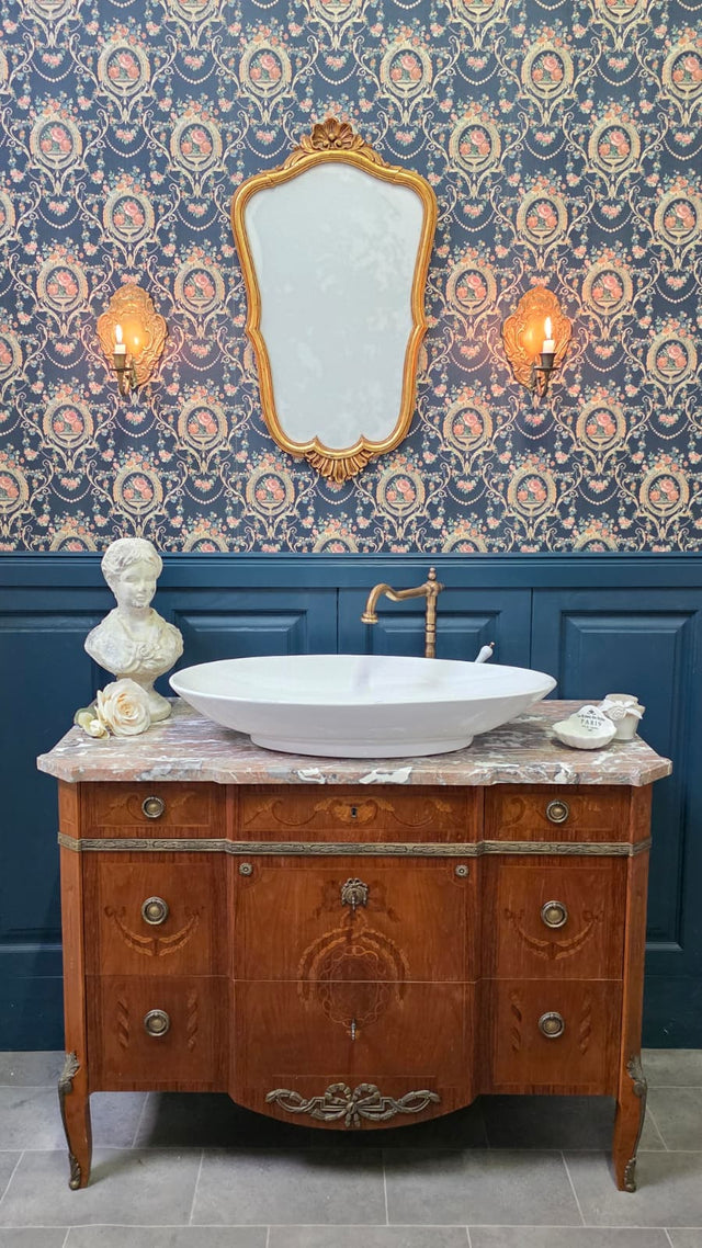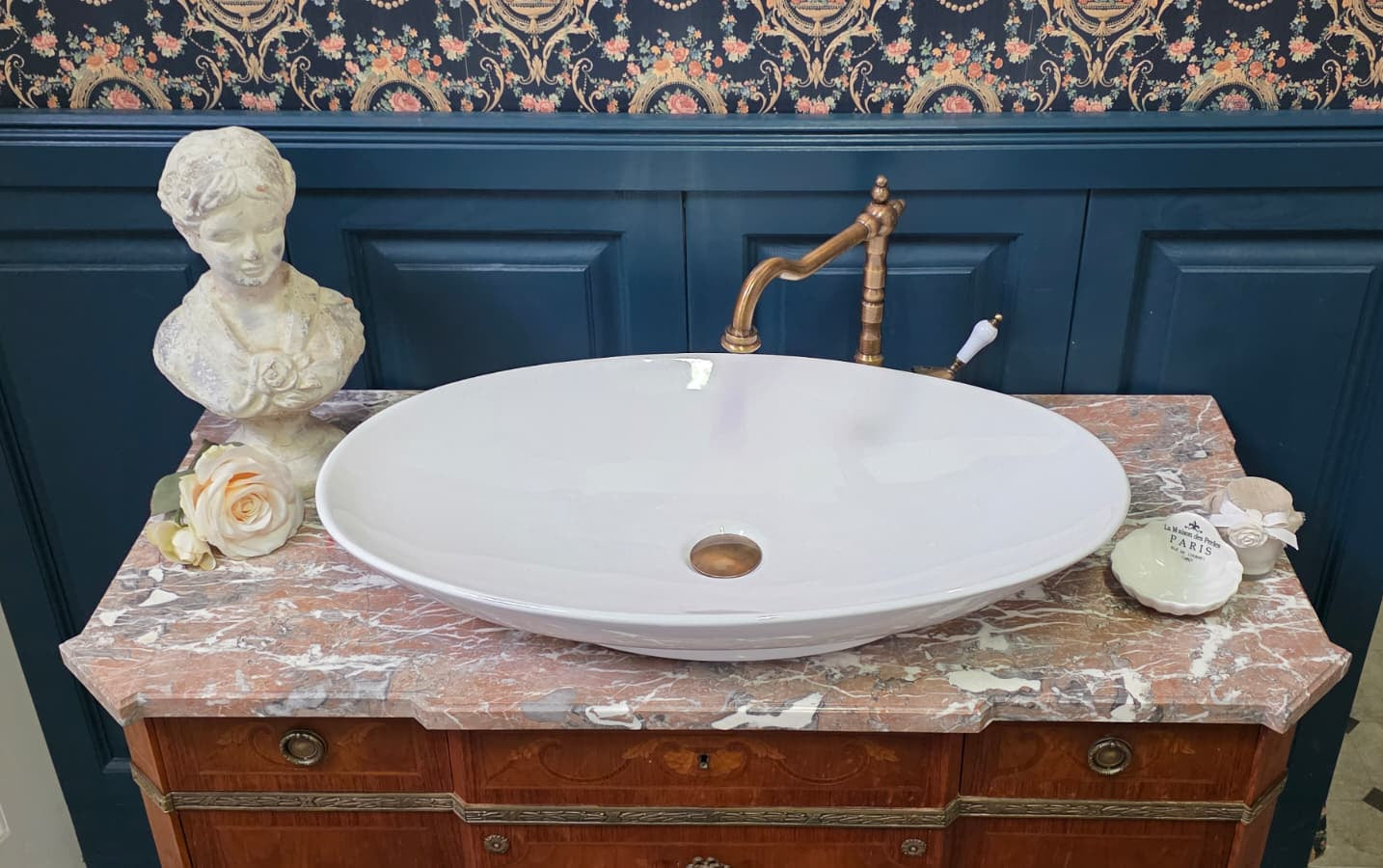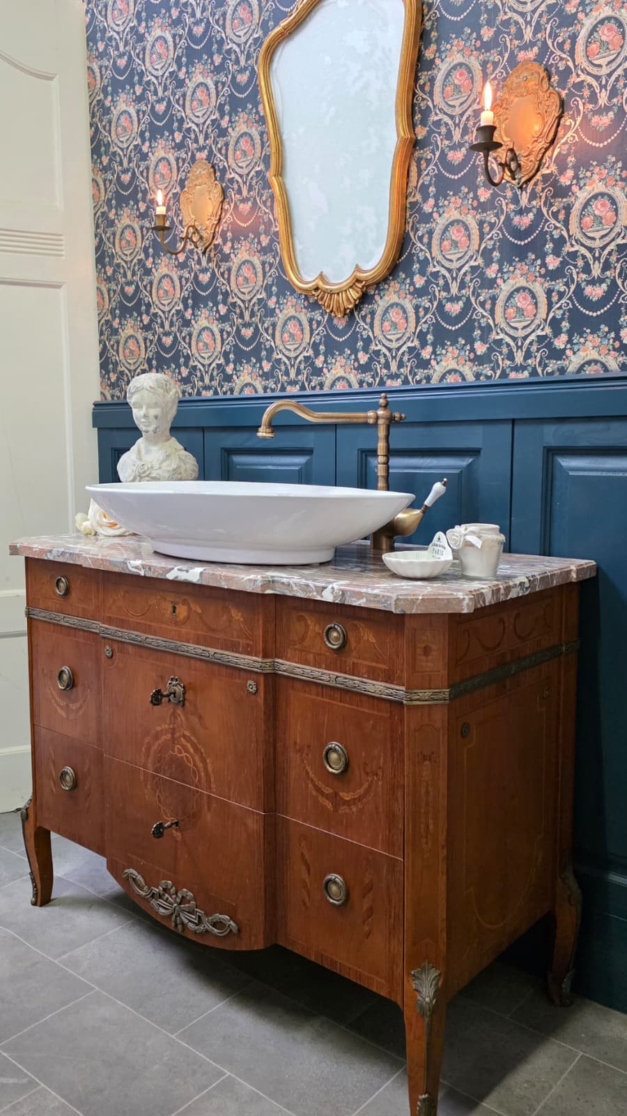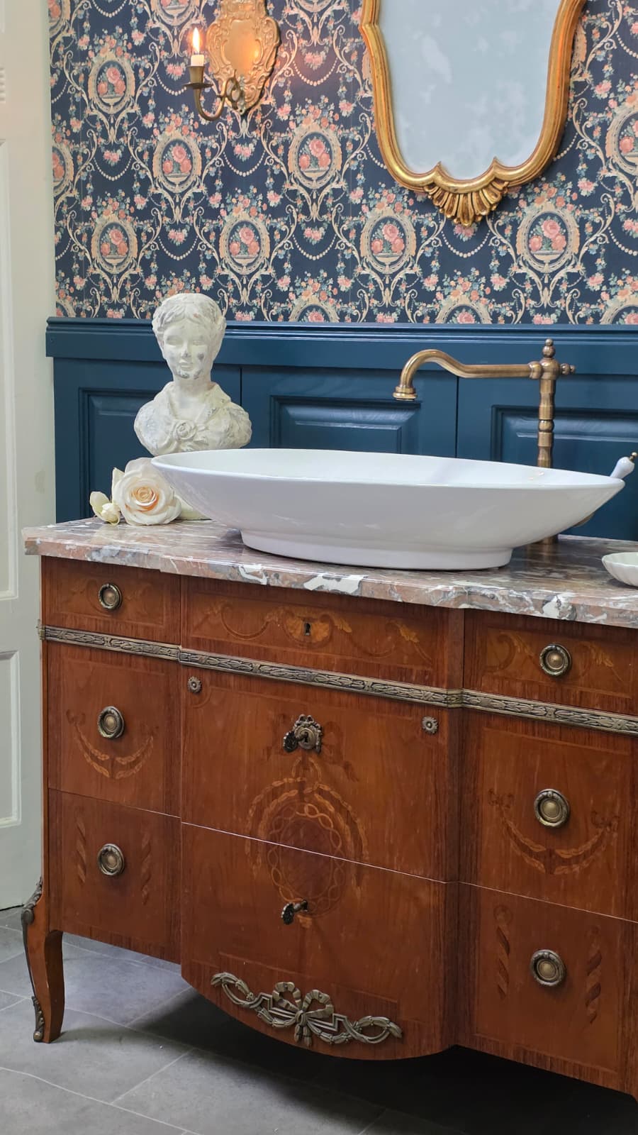 Unser Waschtisch ist ein echtes Unikat. Ursprünglich als antike Kommode zu uns gekommen, wurde sie in unserer Manufaktur zu einem echten vintage Waschtisch umgewandelt. Dabei achten wir besonders darauf, die Geschichte der Kommode zu bewahren. Um den nostalgischen Vintage-Charme zu erhalten, haben wir nicht alle Gebrauchsspuren und Abnutzungsspuren entfernt. So bleibt die besondere Geschichte jedes Stücks lebendig.