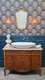 Bringen Sie den romantisch, eleganten Charme einer längst vergangener Epoche in Ihr Badezimmer: Der romantische Waschtisch "Romy" zaubert mit Holz in warmen Nuancen und einer praktischen und ebenso schönen Marmorplatte, feine Nostalgie ins Badezimmer. Getragen von elegant geschweiften Füßen wird das Auge auf die zierlichen Dekore der Front und Seiten gelenkt.  Alle Teile sind original erhalten und wurden behutsam versiegelt.