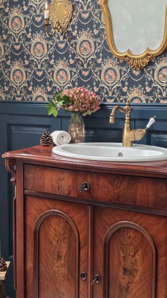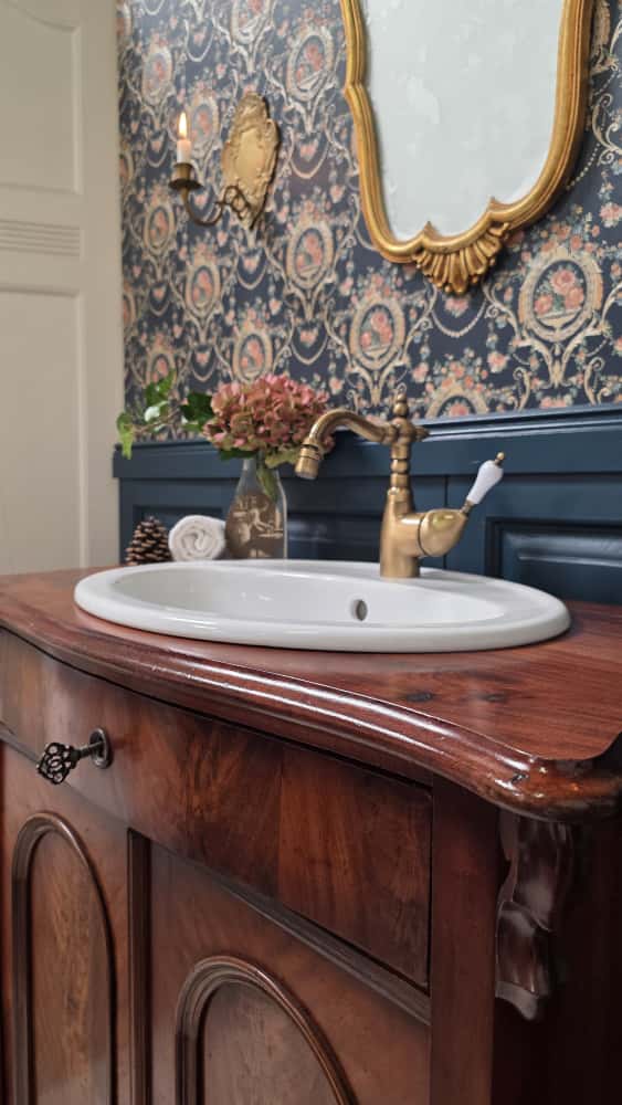 Aus dem antiken Buffet wurde letzte Woche noch ein ganz besonderes schöner Waschtisch- ein Blickfang für das besondere Landhaus Badezimmer, mit dem Chic und Charme einer längst vergangenen Epoche.