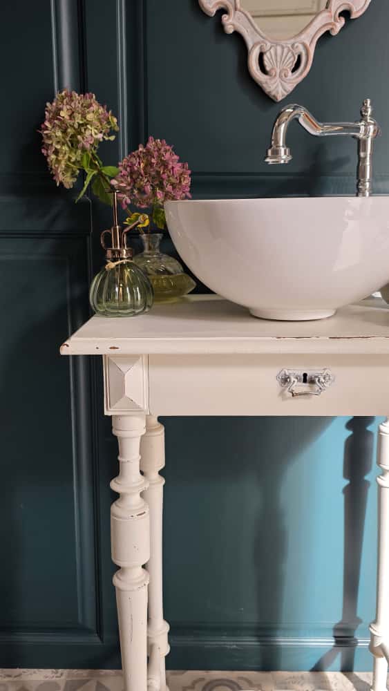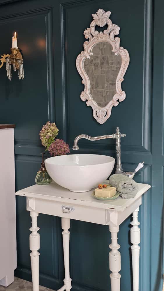 Aus dem antiken Buffet wurde letzte Woche noch ein ganz besonderes schöner Waschtisch- ein Blickfang für das besondere Landhaus Badezimmer, mit dem Chic und Charme einer längst vergangenen Epoche.