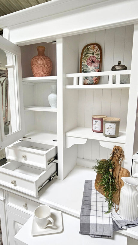 Ein Schrank fürs Wohnzimmer muss für uns zwei wichtige Kriterien erfüllen. Einerseits möchten wir einen Ort schaffen, an dem wir uns wohlfühlen und gerne Zeit verbringen. Andererseits müssen die Wohnzimmermöbel praktisch sein und viel Stauraum bieten, für unsere Lieblingsbücher, die Spielesammlung, das gute Geschirr und vieles mehr. Unser Wohnzimmer-Schrank erfüllt beide Anforderungen perfekt. Durch die nostalgische Bauweise schafft der Wohnzimmerschrank Landhaustil eine warme, gemütliche Atmosphäre mit natürlicher Frische. Dank der großzügigen Schubladen und Türfächer bieten unsere Wohnzimmermöbel viel Stauraum mit verschiedenen Organisationsmöglichkeiten. Einige unserer Wohnzimmerschränke im Landhausstil sind zudem mit Glastüren kombiniert, um schönen Schmuckstücken und Dekorationen einen würdigen Ausstellungsraum zu bieten.