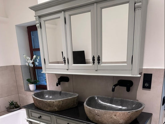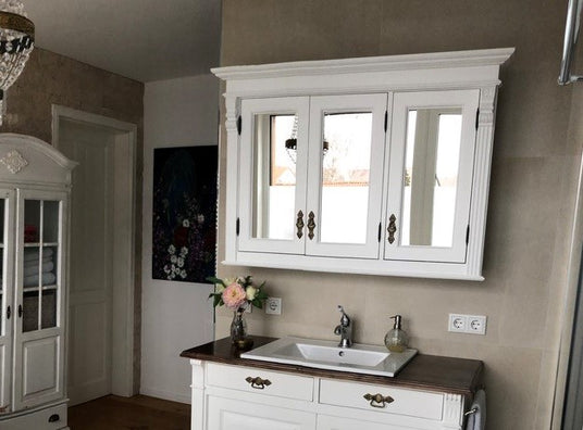A mirror cabinet in the bathroom combines the practical with the necessary and also saves a lot of space. We offer you hanging country house mirror cabinets, which we paint in white or glaze in natural colors. Our solid wood mirror cabinets are ideally protected against moisture in the bathroom thanks to the lacquer or glaze used and are a stylish addition to your bathroom.