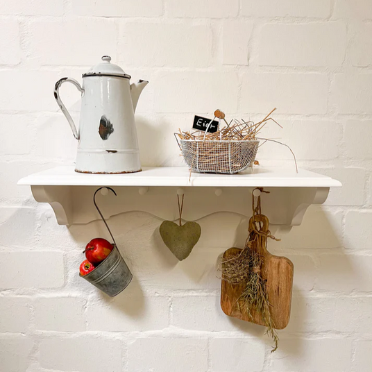 Ein aparter Blickfang und praktischer Alltagshelfer- die Hakenleiste mit Regal passt wunderbar zum Landhausstil und hält stets das Handtuch griff bereit, auf dem Regal finden hübsche Kleinigkeiten ihren Platz.