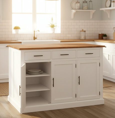 "Monuiso" - kitchen island with oak top, storage space and room for boxes or chairs