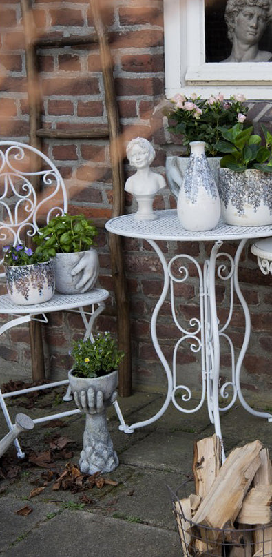 Setzen Sie einen besonderen Blickfang in Ihrem Garten oder auf dem Balkon - mit dem zauberhaft zierlichen Landhaus Garten Set  "Viola" zieht Romantik ins Grüne und lädt den Betrachter ein zu Verweilen: Ob zum Café unterm Apfelbaum, zur Lesestunde auf der Wiese oder zum kleinen Frühstück zu Zweit, das Gartenmöbel Set  zieht mit Ihnen schnell vom Schatten in die Sonne, bietet Platz für das "petite déjeuner" und lässt sich ebenso leicht auch wieder verstauen. Das Eisen nimmt mit der Zeit eine wunderbare Patina an und wirkt somit wie aus den Gärten der Nostalgie in Frankreich.
