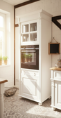 The cassette elements on the doors and sides of the cabinet give it additional character and a touch of old tradition. They are reminiscent of old times and underline the rural charm that the oven cabinet embodies. The turned feet of the oven cabinet are another detail that reflects the craftsmanship and attention to detail. They give the cabinet stability and combine harmoniously with the solid wood and the fresh white.