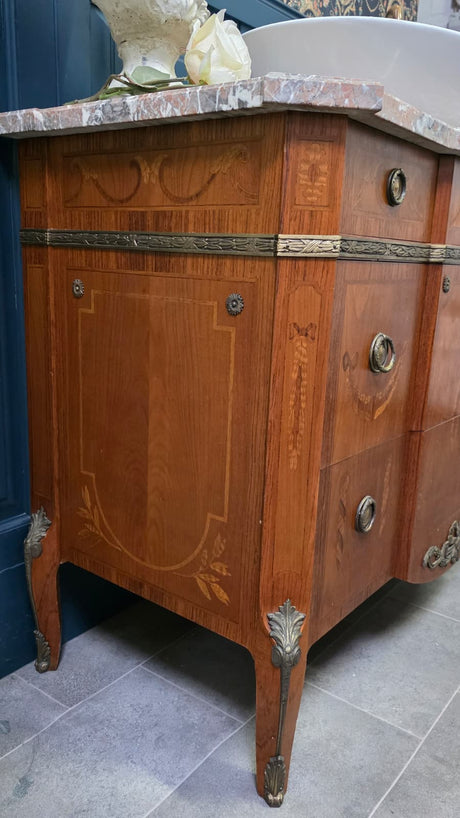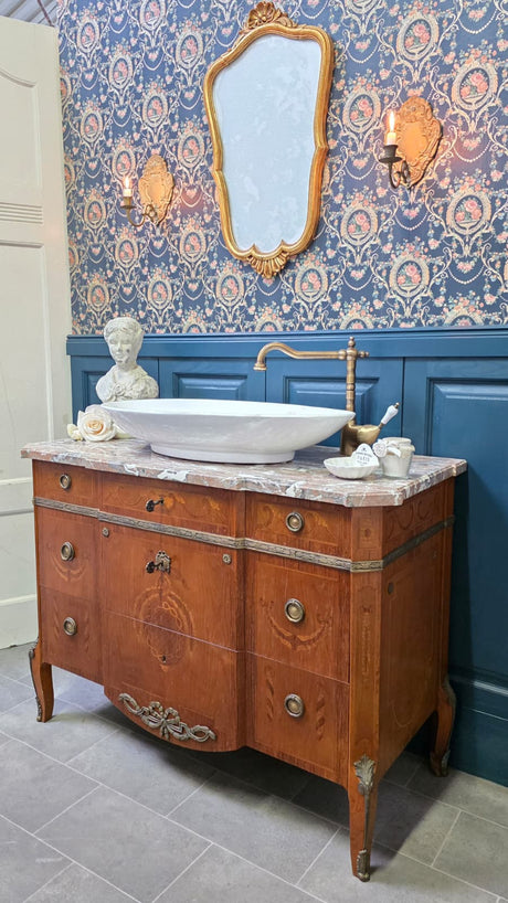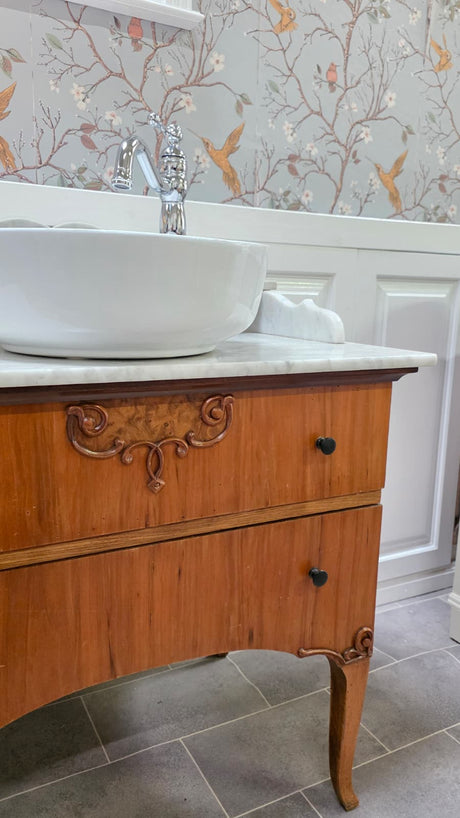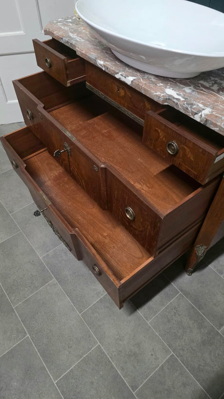 Absolut! Ein Vintage-Waschtisch kann wunderbar in ein modernes Badezimmer integriert werden und dabei eine einzigartige, stilvolle Note hinzufügen. Vier gute Gründe für einen den beliebt Mix-and-Match-Trend: Kontrast und Individualität: Der Einsatz eines Vintage-Waschtischs schafft einen interessanten Kontrast zu den modernen Elementen im Badezimmer und verleiht dem Raum eine individuelle Note, die sich von üblichen Möbelhaus-Standards abhebt. Zeitlose Eleganz: Vintage-Designs sind zeitlos und elegant. Ein Vintage-Waschtisch kann daher einen Hauch von Klasse und Raffinesse in ein modernes Badezimmer bringen. Funktionalität: Unsere Vintage-Waschtische werden mit einem modernen, hochwertigen Keramikbecken kombiniert. Die Schubladen und Fächer werden so umgebaut, dass sie viel Stauraum bieten und gut gängig sind. Auf Wunsch statten wir die Schubladen mit Fächern aus. Nachhaltigkeit: Die Wiederverwendung von Vintage-Möbeln trägt zur Nachhaltigkeit bei, indem Ressourcen geschont werden. Dieser Aspekt ist moderner als jedes vermeintlich modische Möbelstück, das meist nach wenigen Jahren wieder aussortiert werden muss, während unsere Design-Klassiker auch die nächsten 50 Jahre locker überleben.